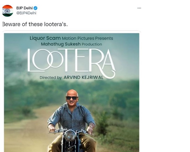ଅବକାରୀ ନୀତିରେ କଥିତ ଘୋଟାଲାକୁ ନେଇ ଭାଜପା ଏଏପି ନେତାଙ୍କୁ ଏଭଳି ଦର୍ଶାଇଛି । ଏହି ପୋଷ୍ଟରରେ ‘ଲିକର ସ୍ମୋକ ମୋଶନ ପିକ୍ଚର୍ସ ପ୍ରେଜେଣ୍ଟସ୍’ ପରେ ‘ମହାଠକ ସୁକେଶ ପ୍ରଡକଶନ’ ଓ ‘ଅରବିନ୍ଦ କେଜିୱାଲଙ୍କ ଦ୍ୱାରା ନିର୍ଦ୍ଦେଶିତ’ ବୋଲି ଲେଖାଯାଇଛି ।