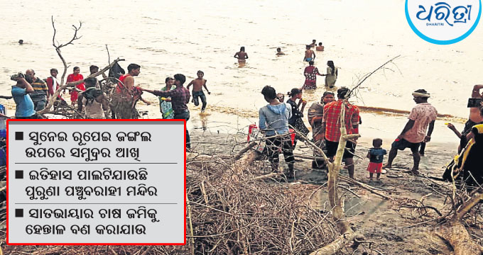 କେନ୍ଦ୍ରାପଡ଼ା,୧୦ା୬(ଜଗନ୍ନାଥ ଧଳ): ସାବିତ୍ରୀ ଅମାବାସ୍ୟାରେ ସମୁଦ୍ର କୂଳ ଲଘିଂ କେନ୍ଦ୍ରାପଡ଼ା ଜିଲା ମହାକାଳପଡ଼ା ବ୍ଲକ ତଣ୍ଡା ଅଞ୍ଚଳକୁ ପାଣି ପଶିଥିଲା। ତଟକ୍ଷୟର ଏହି ପରିସ୍ଥିତି ତଟାଞ୍ଚଳବାସୀଙ୍କ ମନରେ ଭୟ ଆଣିଛି। ଜିଲାରେ ବଙ୍ଗୋପସାଗରର ୪୮ କିଲୋମିଟର ଲମ୍ବର ତଟରୁ ପ୍ରାୟ ୨୮ କିଲୋମିଟର ଅଞ୍ଚଳରେ ଭୟାବହ ପରିସ୍ଥିତି ସୃଷ୍ଟି ହୋଇଛି। ସାତଭାୟାଠାରେ ଗତ ବର୍ଷକ ମଧ୍ୟରେ ପ୍ରାୟ ୪୦ ମିଟର ତଟକ୍ଷୟ ହୋଇଛି। ରାଜନଗର ବ୍ଲକ ସାତଭାୟାର ପୁରୁଣା ପଞ୍ଚୁବରାହୀ ମନ୍ଦିର ଓ ବରାହୀପୁର ଏହି ବର୍ଷାଋତୁ ମଧ୍ୟରେ ଇତିହାସ ପାଲଟିବାକୁ ଯାଉଥିବା ବେଳେ ସମୁଦ୍ରର ଆଖି ନିକଟସ୍ଥ ସୁନେଇ ରୂପେଇ ଜଙ୍ଗଲ ଉପରେ ପଡିଛି। ଏହାର ନିରାକରଣ ପାଇଁ ସାତଭାୟାର ଅବଶିଷ୍ଟ ଚାଷଜମିକୁ ହେନ୍ତାଳବଣ ସୃଷ୍ଟି କରିବା ଆବଶ୍ୟକ ହୋଇପଡିଛି।