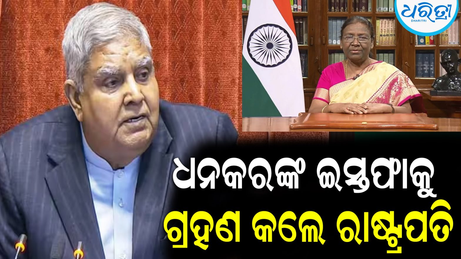 ନୂଆଦିଲ୍ଲୀ,୨୨।୭: ଉପରାଷ୍ଟ୍ରପତି ଜଗଦୀପ ଧନକରଙ୍କ ଇସ୍ତଫାପତ୍ରକୁ ଗ୍ରହଣ କରିଛନ୍ତି ରାଷ୍ଟ୍ରପତି ଦ୍ରୌପଦୀ ମୁର୍ମୁ। ଏ ସମ୍ପର୍କରେ ଖୁବଶୀଘ୍ର ଏକ ବିଜ୍ଞପ୍ତି ଜାରି କରାଯିବ ବୋଲି ଜଣାପଡିଛି।