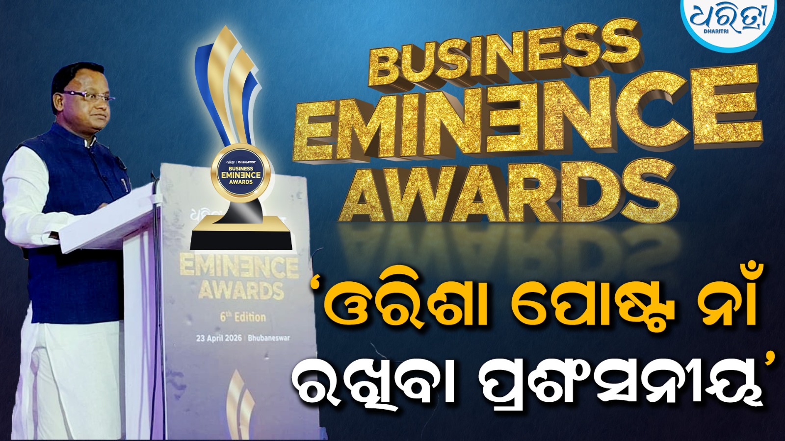 ଭୁବନେଶ୍ୱର,୨୩।୪: ଧରିତ୍ରୀ ଏବଂ ଓଡ଼ିଶା ପୋଷ୍ଟର ମିଳିତ ଆନୁକୂଲ୍ୟରେ ଆୟୋଜିତ ବିଜିନେସ ଏମିନେସ୍ସ ଆଓ଼୍ବାଡର୍ସ ୨୦୨୬ର ଷଷ୍ଠ ସଂସ୍କରଣ ଗୁରୁବାର ଭୁବନେଶ୍ୱରର ହୋଟେଲ ସ୍ୱସ୍ତି ପ୍ରିମିୟମରେ ଅନୁଷ୍ଠିତ ହୋଇଯାଇଛି। ମୁଖ୍ୟମନ୍ତ୍ରୀ ମୋହନ ଚରଣ ମାଝୀ ଏବଂ ଶିଳ୍ପ-ଦକ୍ଷତା ବିକାଶ ତଥା ବୈଷୟିକ ଶିକ୍ଷା ମନ୍ତ୍ରୀ ସମ୍ପଦ ଚନ୍ଦ୍ର ସ୍ୱାଇଁ ଯୋଗ ଦେଇଛନ୍ତି।
