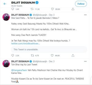 ସାମିଲ ହୋଇଥିବା ଜଣେ ବୃଦ୍ଧା ମହିଳାଙ୍କୁ ଶାହିନ ବାଗର ବିଲକିସ ବନୋ ବୋଲି ଚିହ୍ନଟ କରିଥିଲେ ବଲିଉଡ୍ କୁଇନ କଙ୍ଗନା। ଏହାକୁ ଦିଲଜୀତ ସମାଲୋଚନା କରିଥିଲେ। ଉକ୍ତ ମହିଳାଙ୍କ ନାମ ମହିନ୍ଦର କୌର ଥିବା ଏକ ଭିଡିଓ ଶେୟାର କରିଥିଲେ ଗୁଡ୍ ନ୍ୟୁଜ ଷ୍ଟାର ଦିଲଜୀତ। ଏହାପରେ କଙ୍ଗନା ନିଜ ପୋଷ୍ଟ ଡିଲିଟ୍ କରିବା ସହ ଦିଲଜୀତଙ୍କୁ ଫିଲ୍ମମେକର କରନ ଜୋହରଙ୍କ ପୋଷା ବୋଲି କହିଥିଲେ। ଏହିଠୁ ଆରମ୍ଭ ହୋଇଥିଲା ଦୁଇ ଷ୍ଟାରଙ୍କ ମଧ୍ୟରେ ଟୁଇଟର ଓ୍ବାର।