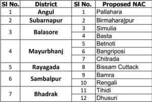 ଭୁବନେଶ୍ୱର,୧୬।୮: ରାଜ୍ୟରେ ନୂଆ NAC ପାଇଁ ଶନିବାର ଡ୍ରାଫ୍ଟ ନୋଟିସ୍ ପ୍ରକାଶ ପାଇଛି। ୭ ଜିଲାରେ ୧୨ ଏନ୍ଏସି ଗଠନ ହେବା ନେଇ ନଗର ଉନ୍ନୟନ ବିଭାଗ ପକ୍ଷରୁ ବିଜ୍ଞପ୍ତି ଜାରି କରାଯାଇଛି। ଏଥିରେ ଅନୁଗୋଳର ପାଲଲହଡ଼ା, ସୁବର୍ଣ୍ଣପୁରର ବୀରମହାରାଜପୁର, ବାଲେଶ୍ୱରର ସିମୁଳିଆ ଏବଂ ବସ୍ତା, ମୟୂରଭଞ୍ଜର ବାଙ୍ଗିରିପୋଷି ଏବଂ ଚିତ୍ରଡ଼ା, ରାୟଗଡ଼ାର ବିଷମକଟକ, ସମ୍ବଲପୁରର ବାମରା ଏବଂ ରେଙ୍ଗାଲି, ଭଦ୍ରକ ଜିଲାର ତିହିଡ଼ି ଏବଂ ଧୂଷୁରୀକୁ ଏନ୍ଏସି କରିବା ଦର୍ଶାଯାଇଛି।