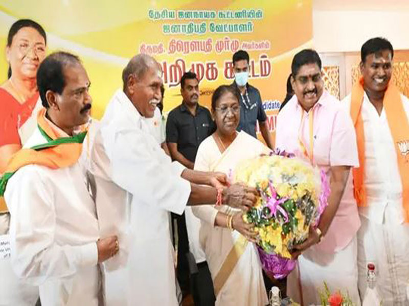 ଚେନ୍ନାଇ, ୨।୭ : ଭାଜପା ନେତୃତ୍ୱାଧିନ ଏନଡ଼ିଏର ରାଷ୍ଟ୍ରପତି ପ୍ରାର୍ଥୀ ଦ୍ରୌପଦୀ ମୁର୍ମୁ ସମର୍ଥନ ଯୋଗାଡ଼ ପାଇଁ ଦକ୍ଷିଣ ଭାରତ ଗସ୍ତ କରିଛନ୍ତି। ଏହି ମର୍ମରେ ସେ ଶନିବାର ତାମିଲନାଡୁରେ ଏଆଇଏଡିଏମ୍କେ ନେତା ତଥା ପୂର୍ବତନ ମୁଖ୍ୟମନ୍ତ୍ରୀ ଇ.ପାଲାନିସାମୀ ଏବଂ ଓ.ପନିରସେଲଭାମ୍ଙ୍କୁ ଭେଟିଛନ୍ତି। ଏହା ସହିତ ସେ ରାଜ୍ୟର ଅନ୍ୟାନ୍ୟ ନେତାଙ୍କ ସହିତ ସାକ୍ଷାତ୍ ଆଲୋଚନା କରିଛନ୍ତି।