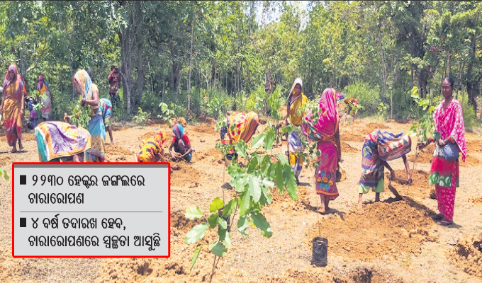 ଭଞ୍ଜନଗର,୧୦ା୭(ବାବୁଲା ପ୍ରଧାନ): ଭଞ୍ଜନଗର ଉତ୍ତର ଘୁମୁସର ବନଖଣ୍ଡ ଏବଂ ଦକ୍ଷିଣ ଘୁମୁସର ବନଖଣ୍ଡର ବିଭିନ୍ନ ଜଙ୍ଗଲର ଖୋଲା ସ୍ଥାନରେ ଚାରାରୋପଣ କାର୍ଯ୍ୟକ୍ରମ ଚାଲିଛି। ଉଭୟ ବନଖଣ୍ଡରେ ୨୨୩୦ ହେକ୍ଟର ଜଙ୍ଗଲରେ ୮ ଲକ୍ଷ ୨୫ ହଜାର ୫୫୦ରୁ ଊର୍ଦ୍ଧ୍ୱ ଚାରା ରୋପଣ ହେବ। ଉକ୍ତ ଚାରାକୁ ବିଭାଗ ପକ୍ଷରୁ ୪ ବର୍ଷ ପର୍ଯ୍ୟନ୍ତ ତଦାରଖ କରାଯିବ। ଗଛକୁ ଜଗିବା ପାଇଁ ଦୁଇଜଣ ଅଗଷ୍ଟ ମାସରୁ ନିୟୋଜିତ ହେବେ। ଗଛ ବଡ ହେବା ପର୍ଯ୍ୟନ୍ତ ୪ ବର୍ଷ ଏହିଭଳି ତଦାରଖ କରାଯିବ। କାମ୍ପା ଯୋଜନାରେ ବର୍ତ୍ତମାନ ଚାରାରୋପଣ ହେଉଛି। ଏଥିସହ ନଦୀ ଏବଂ ନାଳ ଆଡିବନ୍ଧରେ ମଧ୍ୟ ମହାତ୍ମା ଗାନ୍ଧୀ ଜାତୀୟ ଗ୍ରାମୀଣ ନିଶ୍ଚିତ କର୍ମ ନିଯୁକ୍ତି ଯୋଜନାରେ ଚାରାରୋପଣ ହେବ। କାମ୍ପା ଯୋଜନାରେ ଚାରାରୋପଣ ସରିବା ପରେ ଆଡିବନ୍ଧରେ ଚାରାରୋପଣ ହେବ। ବିଗତ କିଛି ଦିନ ହେବ ଭଞ୍ଜନଗର ଅଞ୍ଚଳରେ ସାମାନ୍ୟ ବର୍ଷା ହୋଇଛି। କିନ୍ତୁ ଜୁନ ମାସ ଶେଷ ଆଡ଼କୁ ଜଙ୍ଗଲରେ ଲଗାଯାଇଥିବା ଚାରାଗୁଡିକର ଅବସ୍ଥା କେତେକ ସ୍ଥାନରେ ଭଲ ନାହିଁ। ବର୍ଷା ପାଣି ଅଭାବ ଥିବା ବେଳେ ଅନ୍ୟପଟେ ଟ୍ୟାଙ୍କର ଯୋଗେ ଜଙ୍ଗଲ ଭିତରେ ନେଇ ଗଛକୁ ପାଣି ଦେବା ସମ୍ଭବପର ହୋଇପାରିଲା ନାହିଁ। ତେଣୁ କେତେକ ସ୍ଥାନରେ ବର୍ଷା ପୂର୍ବରୁ ଲାଗିଥିବା ଗଛ ମରିଗଲାଣି। ତେଣୁ ଉକ୍ତ ସ୍ଥାନରେ ଅନ୍ୟ କୌଣସି ଯୋଜନାରେ ନୂଆ ଗଛ ଲଗାଇବା ଆବଶ୍ୟକତା ରହିଛି। ଅପରପକ୍ଷେ ଚାରାରୋପଣ କାର୍ଯ୍ୟକ୍ରମରେ ସ୍ବଚ୍ଛତା ଆଣିବା ପାଇଁ ଡ୍ରୋନ୍‌ ବ୍ୟବହାର କରାଯାଉଛି। ଯେଉଁ ଜଙ୍ଗଲର ଖୋଲା ସ୍ଥାନରେ ଚାରାରୋପଣ ହେବ ସେଥିରେ ପ୍ରଥମେ ଡ୍ରୋନ ସହାୟତାରେ ଜିପିଏସ୍‌ ରିଡିଂ ନିଆଯାଉଛି। ଏହାପରେ ଗାତ ଖୋଳା ହେଉଛି। ପୁଣି ଜିପିଏସ ରିଡ଼ିଙ୍ଗ ନିଆଯାଉଛି । ଗଛ ଲଗାଇବା ପରେ ପୁଣି ଜିପିଏସ ରିଡ଼ିଙ୍ଗ ନିଆଯାଉଛି । ଏହିଭଳି ବାରମ୍ବାର ଡ୍ରୋନ ସହାୟତାରେ ଜିପିଏସ ରିଡିଂ ନିଆଯିବା ଦ୍ୱାରା ପୂର୍ବ ଅପେକ୍ଷା କାର୍ଯ୍ୟରେ ଅଧିକ ସଚ୍ଛତା ଆସୁଥିବା ଜଣାପଡିଛି।