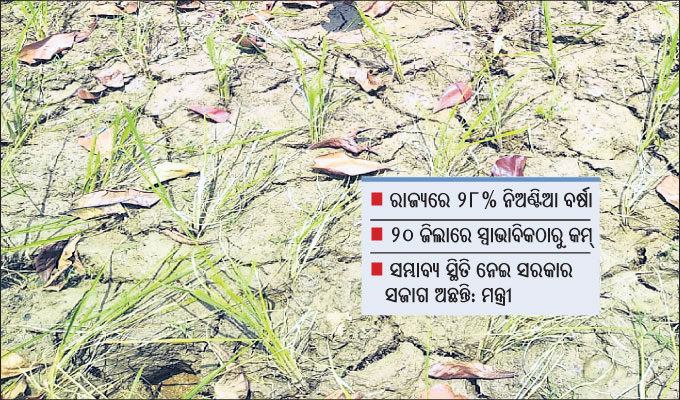 ଭୁବନେଶ୍ୱର ଆଞ୍ଚଳିକ ପାଣିପାଗ କେନ୍ଦ୍ରର ସୂଚନାନୁସାରେ, ଜୁନ୍ ୧ରୁ ଅଗଷ୍ଟ ୯ ମଧ୍ୟରେ ଓଡ଼ିଶାରେ ସମୁଦାୟ ବୃଷ୍ଟିପାତ ୪୮୪.୮ ମି.ମି. ରେକର୍ଡ ହୋଇଛି, ଯାହା ସ୍ବାଭାବିକ ବର୍ଷା ୬୭୭.୭ ମି.ମି. ତୁଳନାରେ ୨୮%ରୁ କମ୍। ଭଦ୍ରକ, ଯାଜପୁର, ଗଜପତି ଓ ବଲାଙ୍ଗୀର ଆଦି ୪ ଜିଲା ସର୍ବାଧିକ ପ୍ରଭାବିତ ହୋଇଛି। ଏସବୁ ଜିଲାରେ ୪୦% କିମ୍ବା ତା’ଠାରୁ ଅଧିକ ଅଭାବୀ ବର୍ଷା ଦେଖାଯାଇଛି। ତେବେ ଅଗଷ୍ଟରେ ମୌସୁମୀ ଦୁର୍ବଳ ରହିଛି। ଫଳରେ ଗତ ୧ରୁ ୯ ତାରିଖ ମଧ୍ୟରେ ୭୫% ନିଅଣ୍ଟିଆ ବର୍ଷା ରେକର୍ଡ କରାଯାଇଛି, ଯାହା ସ୍ବାଭାବିକ ବର୍ଷା ୧୧୫.୪ ମି.ମି.ଠାରୁ ୨୮.୫ ମି.ମି. ରହିଛି। ସୋମବାର ଭୁବନେଶ୍ୱରରେ ସର୍ବାଧିକ ୨୨.୭ମିମି ବର୍ଷା ରେକର୍ଡ କରାଯାଇଥିବାବେଳେ କଟକ, ଝାରସୁଗୁଡ଼ା, ବାରିପଦାରେ ମଧ୍ୟ ବର୍ଷା ହୋଇଛି। କିନ୍ତୁ ଆସନ୍ତା ୫ରୁ ୬ଦିନ ମଧ୍ୟ କମ୍ ବର୍ଷା ହେବ ଓ କିଛି ଜିଲାରେ ବିଜୁଳି ଘଡ଼ଘଡ଼ି ପ୍ରଭାବରେ ସ୍ବଳ୍ପରୁ ମଧ୍ୟମ ଧରଣର ବର୍ଷା ହେବାର ସମ୍ଭାବନା ରହିଛି। ଏଥିପାଇଁ ବିଭିନ୍ନ ଜିଲାକୁ ୟେଲୋ ଓ୍ବାର୍ନିଂ ଜାରି କରିଛି ପାଣିପାଗ କେନ୍ଦ୍ର।