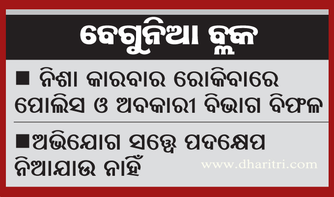 ଯେ, ଏହି ବ୍ଲକ ଅଧୀନରେ ୧୬୨ଗ୍ରାମ ରହଛି। ହେଲେ ଏଠାରେ ନିଶା କାରବାର ରୋକିବାକୁ ରହିଥିବା ପୋଲିସ ଓ ଅବକାରୀ ବିଭାଗ ବିଫଳ ହୋଇଛି। ନକଲି ଦେଶୀ ଓ ବିଦେଶୀ ମଦ ପ୍ରସ୍ତୁତ କରାଯାଇ ଖୁଲମଖୁଲା ବିକ୍ରି କରାଯାଉଛି। ଏହା ଦ୍ୱାରା ବେପାରୀମାନେ ଲାଭବାନ ହେଉଥିବା ବେଳେ ଯୁବପିଢ଼ି ବିପଥଗାମୀ ହେଉଛନ୍ତି। ଡାଳତୋଳା, ସିକୋ, ଖଣତି, କୁଶପଲ୍ଲା, ବଡ଼ପଦର, କୋଲୁହାପାଟଣା, ଗୁଡୁମ, ଏକଡାଳିଆ, ପିଚୁକୁଳି, ସିଉଳା, ସାନପଦର ଅଞ୍ଚଳରେ ଦେଶୀ ମଦ ପ୍ରସ୍ତୁତି ହେଉଥିଲେ ମଧ୍ୟ ପୋଲିସ କିମ୍ବା ଅବକାରୀ ବିଭାଗ ପକ୍ଷରୁ ସେଭଳି ଚଢ଼ାଉ ହେଉନାହିଁ ବୋଲି ସାଧାରଣରେ ମତପ୍ରକାଶ ପାଉଛି। ଅନେକ ସମୟରେ ମଦ ପ୍ରସ୍ତୁତି ଓ ବିକ୍ରିକୁ ନେଇ ମାରପିଟ୍ ମଧ୍ୟ ହେଉଛି। ଗତ ଜାନୁୟାରୀରୁ ଅଦ୍ୟାବଧି ବେଆଇନ ମଦ ବିକ୍ରି ଅଭିଯୋଗରେ ଜଙ୍କିଆ ଥାନା ଅଧୀନ ସିକୋ ଫାଣ୍ଡିରେ ୫ଟି, ବାଘମାରୀ ଥାନାରେ ୨ଟି ଓ ସଦର ଥାନାରେ ୨ଟି ମାମଲା ରୁଜୁ ହୋଇଥିବା ଜଣାପଡ଼ିଛି। ସ୍ଥାନୀୟ ଅବକାରୀ ବିଭାଗ ପକ୍ଷରୁ ଚଢ଼ାଉ ନ ହେବାରୁ ଗ୍ରାମାଞ୍ଚଳରେ ଚୋରା ମଦ କାରବାର ବଢ଼ିଚାଲିଛି। ଏନେଇ ସ୍ଥାନୀୟ ସାମାଜିକ ସଙ୍ଗଠନର ସଭ୍ୟ ମାୟାଧର ବେହେରା କୁହନ୍ତି, ବେଆଇନ ମଦ କାରବାର ଯୋଗୁ ଗ୍ରାମାଞ୍ଚଳରେ ଅସାମାଜିକଙ୍କ ଉତ୍ପାତ ବଢ଼ିବାରେ ଲାଗିଛି। ନିଶା ନିବାରଣ ସଚେତନତା ସୃଷ୍ଟି କରାଯିବା ସହ ପୋଲିସ ଓ ଅବକାରୀ ବିଭାଗର କାର୍ଯ୍ୟାନୁଷ୍ଠାନ ଜରୁରୀ ହୋଇପଡ଼ିଛି। ମହିଳା ସଭାନେତ୍ରୀ ରମାମଣି ସାହୁ କହିଛନ୍ତି, ଗ୍ରାମାଞ୍ଚଳରେ ବିକ୍ରି ହେଉଥିବା ଦେଶୀ ମଦ ପିଇ ଲୋକେ ଅସୁସ୍ଥ ହେଉଛନ୍ତି। ଦୈନିକ ରୋଜଗାର ଉପରେ ପ୍ରଭାବ ପଡିବା ସହ ପାରିବାରିକ ବିଶୃଙ୍ଖଳା ହେଉଛି। ଅନ୍ୟପଟେ ବେଗୁନିଆ ଥାନା ଅଧିକାରୀ ଲକ୍ଷ୍ମୀ ପ୍ରସାଦ ଶତପଥୀ କହିଛନ୍ତି, ନିଶା କାରବାର ରୋକିବା ଲାଗି ବିଭିନ୍ନ ସ୍ଥାନରେ ଚଢ଼ାଉ ଜାରି ରହିଛି। ଖୁବ୍ଶୀଘ୍ର ଏହି ବ୍ଲକ ଅଞ୍ଚଳ ନିଶା ମୁକ୍ତ ହେବ।