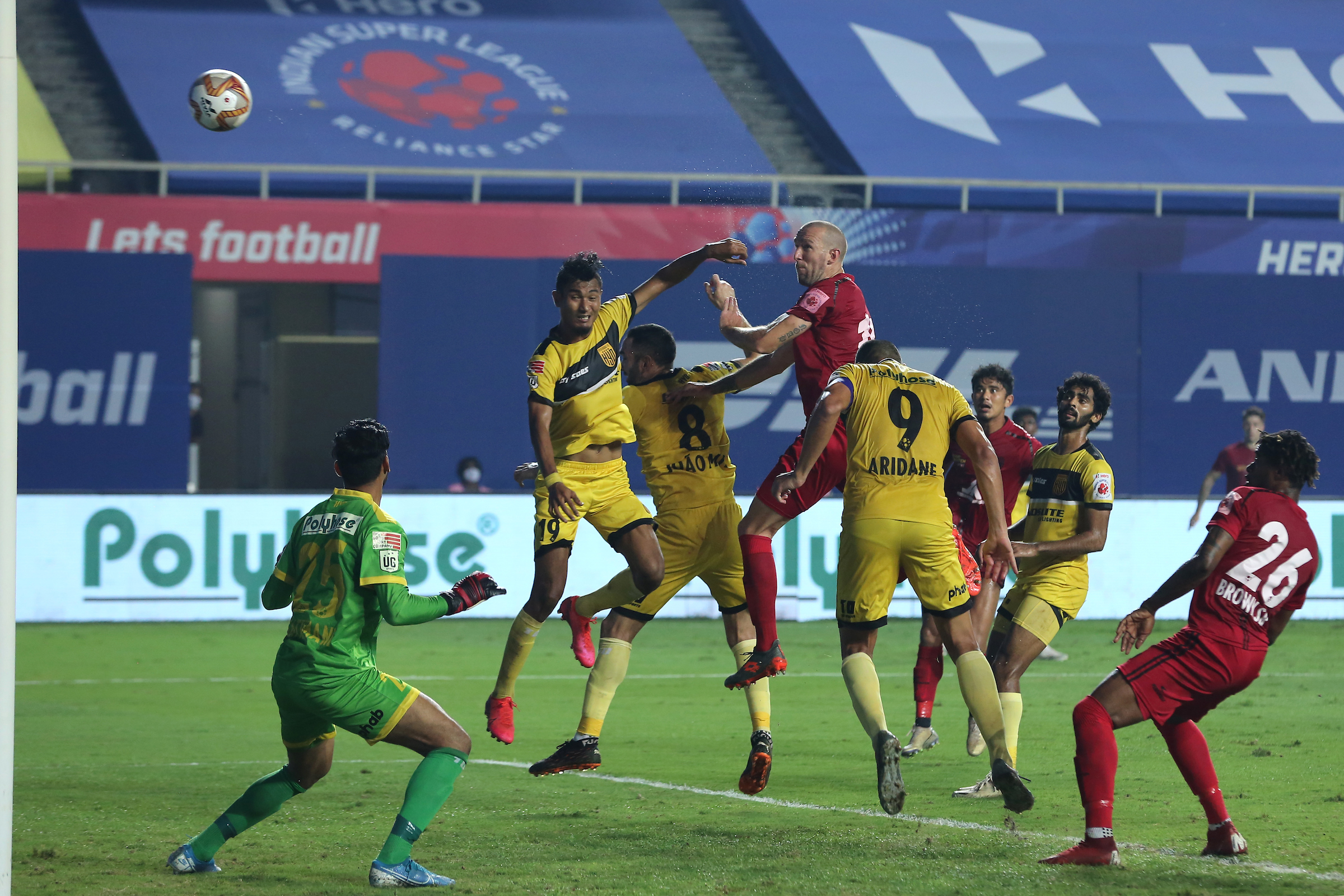 Benjamin Edouard Lambot of NorthEast United FC go up for header during match 86 of the 7th season of the Hero Indian Super League between Hyderabad FC and NorthEast United FC held at the Tilak Maidan Stadium, Goa, India on the 7th February 2021 Photo by Deepak Malik / Sportzpics for ISL