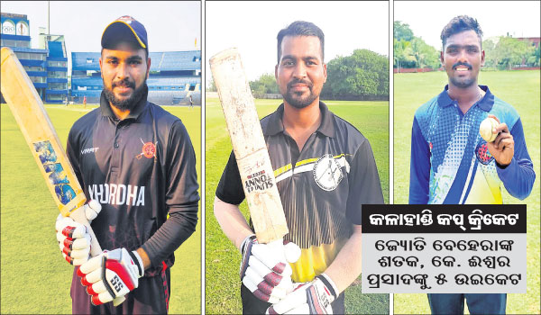ଭୁବନେଶ୍ୱର, ୮ା୪(କ୍ରୀଡ଼ା ପ୍ରତିନିଧି): ଓଡ଼ିଶା କ୍ରିକେଟ ଆସୋସିଏଶନ ଆନୁକୂଲ୍ୟରେ କଟକର ବିଭିନ୍ନ ଗ୍ରାଉଣ୍ଡରେ ଚାଲିଥିବା କଳାହାଣ୍ଡି କପ୍ କ୍ରିକେଟ ଟୁର୍ନାମେଣ୍ଟର ଡାଇମଣ୍ଡ-ଏ ଓ ସିଲ୍ଭର-ଏ ଗ୍ରୁପ୍ର ୬ଟି ମ୍ୟାଚ ଶୁକ୍ରବାର ଅନୁଷ୍ଠିତ ହୋଇଯାଇଛି। ଏଥିରେ ଇକୋର୍ସା, ଖୋର୍ଦ୍ଧା, ସୁନ୍ଦରଗଡ଼, ଗଞ୍ଜାମ, ପାରାଦୀପ, ଗଜପତି ଦଳ ବିଜୟୀ ହୋଇଛି। ଖୋର୍ଦ୍ଧାର ଜ୍ୟୋତି ବେହେରା ଶତକ ହାସଲ କରିଥିବାବେଳେ ଗଞ୍ଜାମ ଦଳର କେ. ଈଶ୍ୱର ପ୍ରସାଦ ୫ ଉଇକେଟ ସଫଳତା ପାଇଛନ୍ତି।