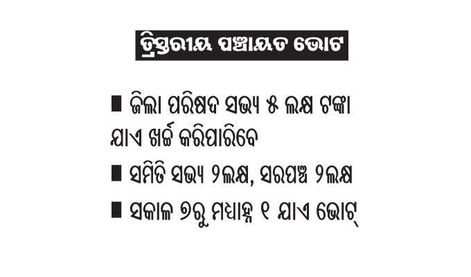 ଗତ ୬ ତାରିଖରେ ଅନୁଷ୍ଠିତ ସର୍ବଦଳୀୟ ବୈଠକରେ ପ୍ରାର୍ଥୀଙ୍କ ନିର୍ବାଚନୀ ଖର୍ଚ୍ଚ ରାଶିକୁ ବଢ଼ାଇବା ସହ ଭୋଟଦାନ ଅବଧି ଆଉ ୨ ଘଣ୍ଟା ବୃଦ୍ଧି କରିବାକୁ ରାଜନୈତିକ ଦଳଗୁଡିକ ପକ୍ଷରୁ ପ୍ରସ୍ତାବ ଦିଆଯାଇଥିଲା। ଏଥିସହିତ ସରପଞ୍ଚ ଓ ସମିତି ସଭ୍ୟଙ୍କ ନିର୍ବାଚନୀ ଖର୍ଚ୍ଚ ୮୦ ହଜାର ଟଙ୍କାରୁ ବଢାଇ ୨ ଲକ୍ଷ ଏବଂ ଜିଲା ପରିଷଦ ସଭ୍ୟଙ୍କ ପାଇଁ ଖର୍ଚ୍ଚ ୨ ଲକ୍ଷରୁ ୫ ଲକ୍ଷ ଟଙ୍କାକୁ ବୃଦ୍ଧି କରିବାକୁ ପ୍ରସ୍ତାବ ଦିଆଯାଇଥିଲା। ଏହାକୁ ଦୃଷ୍ଟିରେ ରଖି ରାଜ୍ୟ ନିର୍ବାଚନ କମିଶନ ନିର୍ବାଚନ ଖର୍ଚ୍ଚ ଓ ଗାଡି ସଂଖ୍ୟା ଧାର୍ଯ୍ୟ କରିଛନ୍ତି।