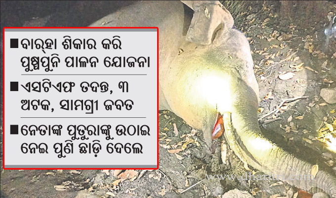 ମିଳିଥିବା ସୂଚନା ମୁତାବକ, ମୃତ ଦନ୍ତା ହାତୀର ବୟସ ପ୍ରାୟ ୧୨ ବର୍ଷ ହେବ। ଦନ୍ତାର ମୃତ୍ୟୁ ହେବା ପରେ ଦାନ୍ତ ନେବାକୁ ଦୁର୍ବୃତ୍ତମାନେ ଚେଷ୍ଟା କରି ବିଫଳ ହୋଇଥିଲେ। ଦୁଇଦାନ୍ତ ସୁରକ୍ଷିତ ଭାବେ ରହିଛି। ବିଦ୍ୟୁତ ତାର ସଂସ୍ପର୍ଶରେ ଆସିଯିବାରୁ ହାତୀର ମୃତ୍ୟୁ ଘଟିଥିବା ପ୍ରାଥମିକ ତଦନ୍ତରୁ ଜଣାପଡିଛି। ଅଟକ ଥିବା ଯୁବକମାନେ ଶିକାରରେ ସାମିଲ ଥିବା ବନ ବିଭାଗ ଆଗରେ ସ୍ବୀକାର କରିଛନ୍ତି। ଶୁକ୍ରବାର ପୁଷ୍ପପୁନି ତିହାର ରହିଥିଲା। ତେଣୁ ପୂର୍ବ ରାତିରେ ବନ୍ୟପ୍ରାଣୀ ଶିକାର କରି ମାଂସକୁ ଭୋଜିଭାତ କରି ଖାଇବା ଓ ବିକ୍ରି କରିବା ପାଇଁ ଶିକାରୀମାନେ ବିଦ୍ୟୁତ ତାର ବିଛାଇଥିଲେ। ହେଲେ ବାର୍ହା, କୁଟୁରା ବଦଳରେ ହାତୀପଲରୁ ଗଜରାଜ ଫାଶରେ ପଡି ଯାଇଥିଲେ। ଫଳରେ ଘଟଣାସ୍ଥଳରେ ହାତୀର ମୃତ୍ୟୁ ଘଟିଥିଲା। ଦୁର୍ବତ୍ତମାନେ ପ୍ରମାଣ ନଷ୍ଟ କରିବା ପାଇଁ ବିଛା ଯାଇଥିବା ତାରକୁ ନେଇ ଯାଇଥିଲେ। ଫଳରେ ଅଞ୍ଚଳରେ କିଛି ସମୟ ପାଇଁ ବିଦ୍ୟୁତ ସରବରାହ ବନ୍ଦ ହୋଇଯାଇଥିଲା। ଏ ସମ୍ପର୍କରେ ଡିଏଫଓ ନୀଳାମ୍ବରନ କହିଛନ୍ତି ଯେ, ବିଦ୍ୟୁତ ତାର ସଂସ୍ପର୍ଶରେ ଆସି ହାତୀର ମୃତ୍ୟୁ ଘଟିଛି। ୩ ଜଣଙ୍କୁ ଅଟକ ରଖାଯାଇଛି। ମୃତଦେହ ରିପୋର୍ଟ ଆସିବା ପରେ ଠିକ ବୟସ ଓ କେବେ ମୃତ୍ୟୁ ହୋଇଛି ଜଣାପଡିବ ବୋଲି କହିଥିଲେ।