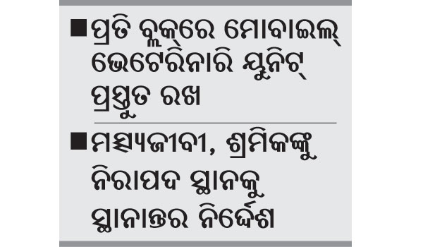 ମତ୍ସ୍ୟ ସମ୍ପଦ ସୁରକ୍ଷା ନିମନ୍ତେ ଆବଶ୍ୟକ ପଦକ୍ଷେପ ଗ୍ରହଣ ଲାଗି ସମସ୍ତ ଜିଲା ମତ୍ସ୍ୟ ଅଧିକାରୀଙ୍କୁ ନିର୍ଦ୍ଦେଶ ଦିଆଯାଇଛି। ମତ୍ସ୍ୟଚାଷୀମାନେ ଜଳାଶୟ ବନ୍ଧକୁ ମଜଭୁତ କରିବେ, ଯେପରି ମାଛ, ଚିଙ୍ଗୁଡ଼ି କିମ୍ବା ଯାଆଁଳ ଭାସି ନ ଯାଆନ୍ତି। ଆବଶ୍ୟକ ସ୍ଥଳେ ଜଳାଶୟର ଜଳସ୍ତରକୁ କମ୍‌ ରଖିବା ପାଇଁ କୁହାଯାଇଛି। ଚିଙ୍ଗୁଡ଼ି ଚାଷରେ ନିୟୋଜିତ ଶ୍ରମିକଙ୍କୁ ନିରାପଦ ସ୍ଥାନକୁ ଚାଲିଯିବା ସକାଶେ କୁହାଯାଇଛି। ଆବଶ୍ୟକ ହେଲେ ଜିଲା ପ୍ରଶାସନ ସହାୟତାରେ ସମ୍ବେଦନଶୀଳ ଅଞ୍ଚଳଗୁଡ଼ିକରୁ ମତ୍ସ୍ୟଜୀବୀ ଓ ଶ୍ରମିକଙ୍କୁ ନିରାପଦ ସ୍ଥାନକୁ ସ୍ଥାନାନ୍ତର କରିବା ଲାଗି ନିର୍ଦ୍ଦେଶ ଦିଆଯାଇଛି। ଜିଲା ମତ୍ସ୍ୟ ଅଧିକାରୀଙ୍କ କାର୍ଯ୍ୟାଳୟରେ କଣ୍ଟ୍ରୋଲରୁମ୍‌ ଖୋଲାଯାଇ ବନ୍ୟା ସ୍ଥିତି ଓ ନିଆଯାଉଥିବା ପଦକ୍ଷେପ ସମ୍ପର୍କରେ ନିୟମିତ ମତ୍ସ୍ୟ ନିର୍ଦ୍ଦେଶାଳୟକୁ ଅବଗତ କରିବାକୁ କୁହାଯାଇଛି। ବିଭାଗ ପକ୍ଷରୁ ପଠାଯାଉଥିବା ଆଡ୍‌ଭାଇଜରିଗୁଡ଼ିକୁ ଅନୁପାଳନ କରିବା ଲାଗି ସମସ୍ତଙ୍କୁ ନିର୍ଦ୍ଦେଶ ଦିଆଯାଇଛି।