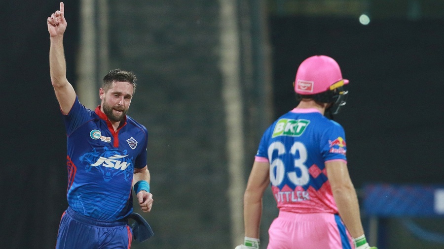 Chris Woakes of Delhi Capitals celebrates after takes a wicket of Jos Buttler of Rajasthan Royal during match 7 of the Vivo Indian Premier League 2021 between the Rajasthan Royals and the Delhi Capitals held at the Wankhede Stadium Mumbai on the 15th April 2021. Photo by Rahul Gulati/ Sportzpics for IPL