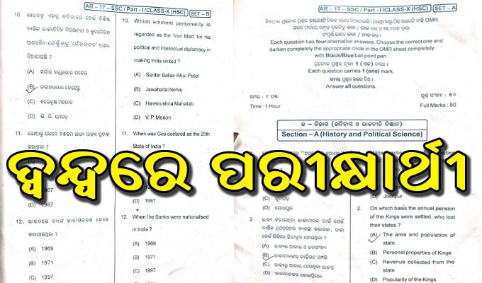 ବରଗଡ଼ ଅଫିସ,୧୮ା୩: ମାଧ୍ୟମିକ ଶିକ୍ଷା ପରିଷଦ, ଓଡ଼ିଶା ପରିଚାଳିତ ହାଇସ୍କୁଲ ସାର୍ଟିଫିକେଟ ପରୀକ୍ଷା(ଏଚ୍ଏସ୍ସି) ଅର୍ଥାତ୍ ମାଟ୍ରିକ ପରୀକ୍ଷାର ଶନିବାର ହୋଇଥିବା ସାମାଜିକ ବିଜ୍ଞାନ (ଇତିହାସ, ଭୂଗୋଳ) ପ୍ରଶ୍ନପତ୍ରରେ ତ୍ରୁଟି ପରିଲକ୍ଷିତ ହୋଇଛି। ଉପରେ ସେଟ୍ ‘ବି’ ପ୍ରଶ୍ନପତ୍ର ଲେଖାଯାଇ ଥିବା ବେଳେ ଭିତରେ ସେଟ୍ ‘ଏ’ର ଅନେକ ପ୍ରଶ୍ନ ରହିଛି। ସେହିପରି ପ୍ରଶ୍ନପତ୍ରରେ କିଛି ପ୍ରଶ୍ନ ଉଭାନ ହୋଇଛି। ଏହାକୁ ନେଇ ପରୀକ୍ଷାର୍ଥୀମାନେ ଦ୍ବନ୍ଦ୍ବରେ ପଡ଼ିଛନ୍ତି। ବରଗଡ଼ ଜର୍ଜ ହାଇସ୍କୁଲ ପରୀକ୍ଷାକେନ୍ଦ୍ରରେ ପରୀକ୍ଷାର୍ଥୀମାନେ ଏହି ତ୍ରୁଟି ଦେଖିବାକୁ ପାଇଛନ୍ତି।