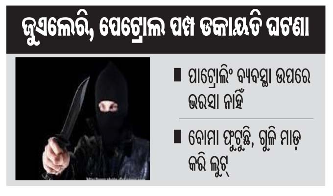 ତାଲା ପଡିଥିବା ଘରୁ ଚୋରି ହେଉଛି। ଦିନଦ୍ୱିପ୍ରହରରେ ଗୁଳି ଫୁଟାଇ, ବୋମା ମାଡ଼ କରି ଡକାୟତି ଚାଲିଛି। ତଥାପି ଅପରାଧୀଙ୍କ ଟେର ପାଉନି ପୋଲିସ। ଶରଣକୁଳ, ରଣପୁର ଓ ନୟାଗଡ଼ ଟାଉନଥାନାର ଡକାୟତି, ଚୋରି ଘଟଣାକୁ ଲକ୍ଷ୍ୟ କଲେ ପୋଲିସର ପାରିବାପଣିଆ ଉପରେ ପ୍ରଶ୍ନବାଚୀ ସୃଷ୍ଟି ହେଉଛି। ଗୋଡିପଡ଼ା ଡକାୟତି ହେଉ ଅଥବା ନୟାଗଡ଼ରେ ଗୋଟିଏ ରାତିରେ ୩ ଚୋରି ଘଟଣା ପୋଲିସ ପାଇଁ ଚାଲେଞ୍ଜ ହୋଇଛି। ଚୋରି, ଡକାୟତି ଘଟଣାରେ ବନ୍ଦ ଥିବା ପୋଲିସ ପାଟ୍ରୋଲିଂ ବ୍ୟବସ୍ଥାକୁ ଦାୟୀ କରାଯାଇଛି। ନୟାଗଡ଼ ସହରର ଲୋକସଂଖ୍ୟା ସହିତ ବିଭିନ୍ନ ଲେନ୍, ଗଳି ବଢ଼ିବାରେ ଲାଗିଛି। ନୂଆ ଏରିଆରେ ପୋଲିସ ଆଦୌ ପାଟ୍ରୋଲିଂ କରୁନାହିଁ। ଶରଣକୁଳ ଓ ରଣପୁର ଥାନା ଅଞ୍ଚଳରେ ଥିବା ଅନେକ ଗାଁକୁ ପୋଲିସର ଭ୍ୟାନ ଆଦୌ ଗଡୁ ନ ଥିବା ଅଭିଯୋଗ ହୋଇଛି।