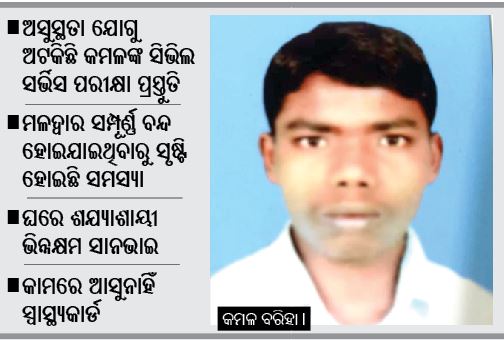 ଗତ ୨୦୨୧ ଅକ୍ଟୋବର ମାସରେ କମଳ ଅସୁସ୍ଥ ହୋଇପଡିଥିଲେ। ତାଙ୍କୁ ଜ୍ୱର ହେବା ସହ ପେଟ ଫୁଲି ଯାଇଥିଲା। ଏହାପରେ ସେ ଖପ୍ରାଖୋଲ ସିଏଚ୍ସି, ପାଟଣାଗଡ ଉପଖଣ୍ଡ ହସ୍ପିଟାଲ ଏବଂ ବଲାଙ୍ଗୀର ଭୀମ ଭୋଇ ମେଡିକାଲ କଲେଜ ହସ୍ପିଟାଲରେ ପର୍ଯ୍ୟାୟକ୍ରମେ ସ୍ବାସ୍ଥ୍ୟ ପରୀକ୍ଷା କରିଥିଲେ। ତାଙ୍କର ମଳଦ୍ୱାର ହଠାତ୍ ବନ୍ଦ ହୋଇଯାଇଥିବା ଜଣାପଡିଥିଲା। ତାଙ୍କୁ ଅସ୍ତ୍ରୋପଚାର ପାଇଁ ବୁର୍ଲା ଭିମସାର ପଠାଯାଇଥିଲା। ସେଠାରେ ଅକ୍ଟୋବର ୨୨ରେ ପ୍ରଥମ ଅସ୍ତ୍ରୋପଚାର କରାଯାଇଥିଲା। ଏହା ସଫଳ ନହେବାରୁ ୨୦୨୨ ଫେବୃୟାରୀ ୧୪ରେ ଦ୍ୱିତୀୟ ଥର ଅସ୍ତ୍ରୋପଚାର ହୋଇଥିଲା। ଏହା ମଧ୍ୟ ସଫଳ ନହେବାରୁ ପେବୃୟାରୀ ୧୬ରେ ତୃତୀୟ ଥର ପାଇଁ ଅସ୍ତ୍ରୋପଚାର କରାଯାଇଥିଲା। ତାଙ୍କ ମଳଦ୍ୱାରା ସମ୍ପୂର୍ଣ୍ଣ ବନ୍ଦ ହୋଇଯାଇଥିବାରୁ ପେଟରେ ଏକ ବିକଳ୍ପ ପାଇପ୍ ଲଗାଯାଇଛି। ଏହାସତ୍ତ୍ୱେ କମଳ ସୁସ୍ଥ ହୋଇନାହାନ୍ତି। ଚତୁର୍ଥ ଥର ପାଇଁ ତାଙ୍କର ଅସ୍ତ୍ରୋପଚାର କରାଯିବ ବୋଲି ଡାକ୍ତରମାନେ ପରାମର୍ଶ ଦେଇଛନ୍ତି। ଏବେ ଏହି ପରିବାର ଘୋର ଆର୍ଥିକ ଓ ମାନସିକ ଯନ୍ତ୍ରଣା ଭୋଗୁଛନ୍ତି। କେଉଁ କାରଣରୁ କମଳଙ୍କ ୩ ଥର ଅସ୍ତ୍ରୋପଚାର ସତ୍ତ୍ୱେ ଅସୁସ୍ଥତା ଲାଗି ରହୁଛି ସେନେଇ ଏହି ଗରିବ ଆଦିବାସୀ ପରିବାରକୁ କିଛି କୁହାଯାଉନାହିଁ। କମଳ ଏବେ ଘରେ ଶଯ୍ୟାଶାୟୀ । ମେଧାବୀ ପୁଅ କମଳଙ୍କ ଏଭଳି ଅବସ୍ଥା ଦେଖି ବରିହା ପରିବାର ସମ୍ପୂର୍ଣ୍ଣ ଭାଙ୍ଗି ପଡିଛନ୍ତି। ସାନବାଞ୍ଜିପାଲିରୁ ଥରେ ବୁର୍ଲା ଯିବା ଆସିବା କରିବାକୁ ଗାଡି ଭଡା ବାବଦକୁ ପ୍ରାୟ ୭ ହଜାର ଟଙ୍କା ଖର୍ଚ୍ଚ କରିବାକୁ ପଡିଛି। ଏହାବାଦ୍ ଅନ୍ୟାନ୍ୟ ଖର୍ଚ୍ଚ ରହିଛି। କମଳଙ୍କ ବାପା ଘନଶ୍ୟାମ ବରିହା (୭୫) ଏବଂ ମାତା ଯମୁନା ବରିହା (୭୦) ପରିଣତ ବୟସରେ। ସାନଭାଇ ଭଜମନ ବରିହା (୨୨) ଜଣେ ଶାରୀରିକ ଭିନ୍ନକ୍ଷମ। ସେ ମଧ୍ୟ ଶଯ୍ୟାଶାୟୀ। ଏକମାତ୍ର ବିବାହିତା ଭଉଣୀ ମଧ୍ୟ ଏବେ ବାପଘରେ ଆଶ୍ରୟ ନେଇଛନ୍ତି। ଏହି ବରିହା ପରିବାରର ଜମି ଅଧ ଏକର ରହିଛି। ଅର୍ଥ ଉପାର୍ଜନ ପନ୍ଥା ନାହିଁ। ଏଭଳି ସ୍ଥିତିରେ କମଳଙ୍କ ଅସୁସ୍ଥତା ଏବଂ ବାରମ୍ବାର ଅସ୍ତ୍ରୋପଚାର ବରିହା ପରିବାରକୁ ଦୋହଳାଇ ଦେଲାଣି। ବରିହା ପରିବାର ପାଖରେ ସ୍ବାସ୍ଥ୍ୟକାର୍ଡ ଥିଲେ ମଧ୍ୟ କୌଣସି କାମରେ ଆସୁନାହିଁ। ଏଭଳି ପରିସ୍ଥିତିରେ କମଳଙ୍କ ଆରୋଗ୍ୟ ପାଇଁ ଉଚ୍ଚତର ଚିକିତ୍ସାର ଆବଶ୍ୟକତା ପଡୁଛି। ସ୍ବାସ୍ଥ୍ୟ ବିଭାଗ କେବଳ ହସ୍ପିଟାଲ ପଠାଇ ଦେଇ କର୍ତ୍ତବ୍ୟ ସମାପନ କର ଦେଉଛି। ବଲାଙ୍ଗୀର ଜିଲା ପ୍ରଶାସନ ପକ୍ଷରୁ ଏହି ଆଦିବାସୀ ପରିବାରକୁ ତୁରନ୍ତ ଆବଶ୍ୟକ ସହାୟତା ଯୋଗାଇ ଦେବାକୁ ଅଞ୍ଚଳବାସୀ ଦାବି କରିଛନ୍ତି।