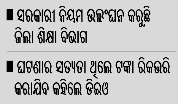 ନବରଙ୍ଗପୁର,୨୪୩ା୯(ବି.ପ୍ର.): ସରକାରୀ ନିୟମ ଉଲ୍ଲଂଘନ କରୁଛି ଜିଲା ଶିକ୍ଷା ବିଭାଗ। ମାସେରୁ ଅଧିକ ସମୟ ଇଏଲ୍ରେ ଥିଲେ ମଧ୍ୟ ଜଣେ ଶିକ୍ଷୟିତ୍ରୀଙ୍କୁ ମିଳୁଛି ନିୟମିତ ଦରମା। ଏଭଳି ଘଟଣାକୁ ନେଇ ଜିଲା ଶିକ୍ଷା ବିଭାଗ ଏବେ ଚର୍ଚ୍ଚାରେ। ନବରଙ୍ଗପୁର ଜିଲା ମେଣ୍ଟ୍ରି ୟୁଜି ହାଇସ୍କୁଲରେ ଏପରି ଏକ ଘଟଣା ଘଟିଛି।
