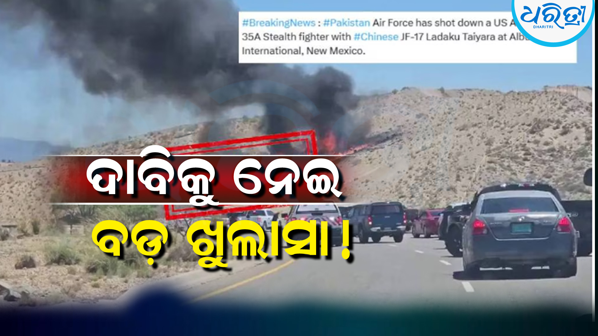 ନୂଆଦିଲ୍ଲୀ,୭।୬: ଲାଇଟହାଉସ ଜର୍ନାଲିଜମକୁ ସୋସିଆଲ ମିଡିଆ ପ୍ଲାଟଫର୍ମରେ ବହୁଳ ଭାବେ ଶେୟାର କରାଯାଉଥିବା ଏକ ଭିଡିଓ ହସ୍ତଗତ ହୋଇଛି। ଭିଡିଓ ସହ ଏହା ଦାବି କରାଯାଉଛି ଯେ ପାକିସ୍ତାନୀ ବାୟୁ ସେନା ନ୍ୟୁ ମେକ୍ସିକୋର ଅଲ୍ବୁକର୍କ ଇଣ୍ଟରନ୍ୟାଶନାଲ ଅର୍ଥାତ ଚାଇନା ଜେଏଫ୍-୧୭ ସେନା ବିମାନ ଦ୍ୱାରା ଆମେରିକୀୟ ବାୟୁସେନାର ଏଫ୍-୩୫ଏ ଷ୍ଟେଲ୍ଥ ଫାଇଟରକୁ ଧ୍ୱଂସ କରିଦିଆଯାଇଛି।