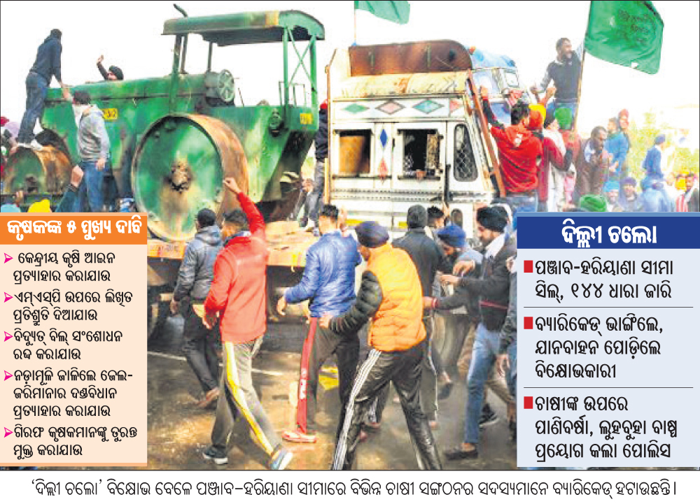 ଗୁରୁବାର ପଞ୍ଜାବର ହଜାର ହଜାର କୃଷକ ଦିଲ୍ଲୀ ଅଭିମୁଖେ ଯାଉଥିବାବେଳେ ପଞ୍ଜାବ-ହରିୟାଣା ସୀମାର ଅମ୍ବାଲା ନିକଟ ଶମ୍ଭୁଠାରେ ହରିୟାଣା ପୋଲିସ ବ୍ୟାରିକେଡ୍ କରି ରାସ୍ତା ଅବରୋଧ କରିଥିଲା। ଚାଷୀମାନେ ତାକୁ ଭାଙ୍ଗି ବ୍ରିଜ୍ ତଳକୁ ଫିଙ୍ଗିଦେବା ପରେ ପୋଲିସ ସେମାନଙ୍କ ଉପରକୁ ଲୁହବୁହା ବାଷ୍ପ ଓ ପାଣି ପ୍ରୟୋଗ କରିଥିଲା। ଅଲ୍ ଇଣ୍ଡିଆ କିଷାନ ସଭା ଅନୁସାରେ ୫୦ ହଜାରରୁ ଅଧିକ ଚାଷୀ ଶୀତକାକର, ବର୍ଷା ଓ ପବନକୁ ଖାତିର ନ କରି ଏହି ଆନ୍ଦୋଳନରେ ସାମିଲ ହୋଇଛନ୍ତି। ସେମାନଙ୍କ ମଧ୍ୟରୁ ଅଧିକାଂଶ ବରିଷ୍ଠ ନାଗରିକ ଓ ମହିଳା ଟ୍ରାକ୍କର ଟ୍ରଲିରେ ଯାଉଥିବାବେଳେ କଲେଜ ଛାତ୍ରୀଛାତ୍ର କାର୍, ବାଇକ୍ରେ ଯାଉଛନ୍ତି। ସେମାନଙ୍କୁ ଘଉଡ଼ାଇବା ପାଇଁ ବ୍ୟାପକ ପୋଲିସ କର୍ମୀ ଓ ରାପିଡ୍ ଆକ୍ସନ ଫୋର୍ସ ଯବାନଙ୍କୁ ମୁତୟନ କରାଯାଇଛି। କେବଳ ଶମ୍ବା ନୁହେଁ, ପଞ୍ଜାବ-ହରିୟାଣା ସୀମାରେ ଥିବା ଅନେକ ସହରରେ ସମାନ ପରିସ୍ଥିତି ଦେଖିବାକୁ ମିଳିଥିଲା। ସାମାବର୍ତ୍ତୀ ଅଞ୍ଚଳରେ ୧୪୪ ଧାରା ଜାରି କରାଯାଇ ସୁରକ୍ଷା ଛାଉଣିରେ ପରିଣତ କରାଯାଇଛି। ଦିଲ୍ଲୀରେ ଉଭୟ ପଞ୍ଜାବ ଓ ହରିୟାଣାର ପ୍ରାୟ ୩ ଲକ୍ଷ ଚାଷୀ ପହଞ୍ଚତ୍ବା ପାଇଁ ଆନ୍ଦୋଳନରେ ସାମିଲ ହୋଇଥିବା ପୋଲିସ ଆକଳନ କରିଛି। ବିକ୍ଷୋଭରତ ଚାଷୀମାନେ ଦିଲ୍ଲୀକୁ ପ୍ରବେଶ କରିବାକୁ ଦିଆ ନ ଗଲେ ଜାତୀୟ ରାଜଧାନୀ ସହ ସଂଯୋଗ କରୁଥିବା ସମସ୍ତ ରାସ୍ତା ବନ୍ଦ କରିଦେବେ ବୋଲି ଧମକ ଦେଇଛନ୍ତି। ବିକ୍ଷୋଭ ଯୋଗୁ ଦିଲ୍ଲୀରୁ ପଡ଼ୋଶୀ ସହରଗୁଡ଼ିକୁ ମେଟ୍ରୋ ସେବାକୁ ବାତିଲ କରିଦିଆଯାଇଛି। ପଞ୍ଜାବ-ହରିୟାଣା ସୀମାକୁ ସିଲ୍ କରାଯାଇ ଯାନବାହନଗୁଡ଼ିକୁ ଯାଞ୍ଚ କରାଯାଉଛି। ଏହାର ପ୍ରତିବାଦରେ ବିକ୍ଷୋଭକାରୀମାନେ କେତେକ ସରକାରୀ ଯାନବାହନ ଜାଳିଦେଇଛନ୍ତି।