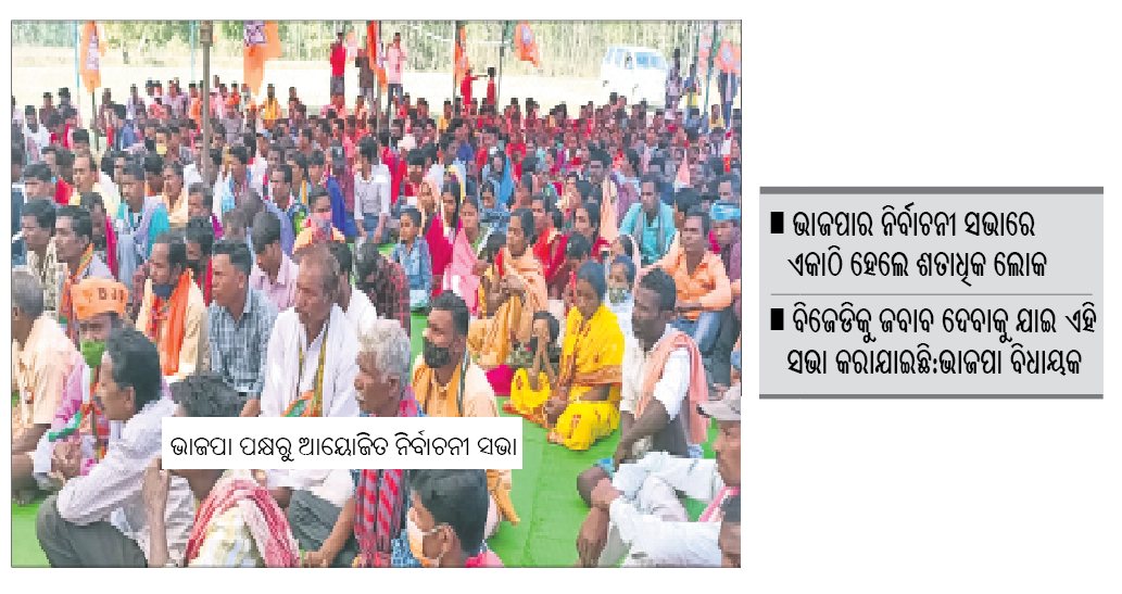 ଉମରକୋଟ, ୩ା୨(ସ୍ବ.ପ୍ର.) ବିଜେଡି ପରେ ଭାଜପା। ଶାସକ ବିଜେଡି ଦଳକୁ ଜାବାବ ଦେବା ପାଇଁ ସମାନ ରଣନୀତି ଆପଣାଇଛି ଭାଜପା। ବିଜେଡି ଭଳି ଭାଜପା ମଧ୍ୟ ଶତାଧିକ ଲୋକଙ୍କୁ ନେଇ ନିର୍ବାଚନୀ ସଭା ଓ ଭୋଜିଭାତର ଆୟୋଜନ କରିଛି। ଶାସକ ଦଳକୁ ଜବାବ ଦେବାକୁ ଯାଇ ଏପରି କରିବାକୁ ବାଧ୍ୟ ହୋଇଛୁ ବୋଲି ଉମରକୋଟ ବିଧାୟକ ନିତ୍ୟାନନ୍ଦ ଗଣ୍ଡ କହିଛନ୍ତି।