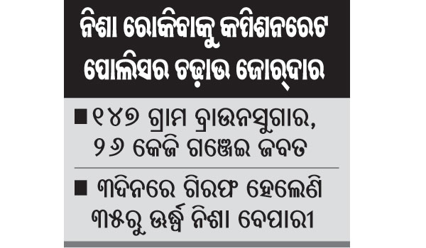 ଏୟାରପୋର୍ଟ ଥାନା ପୋଲିସ ଲିଙ୍ଗରାଜ ଥାନା ଅଞ୍ଚଳରେ ରହୁଥିବା ପୁରୀ ଜିଲାର ଦୀପକ ମହାପାତ୍ରଙ୍କୁ ଗିରଫ କରିବା ସହ ତାଙ୍କଠାରୁ ୨୨.୩୪ ଗ୍ରାମ ବ୍ରାଉନସୁଗାର ଜବତ କରିଛି। ସେହିପରି କ୍ୟାପିଟାଲ ଥାନା ପୋଲିସ ୟୁନିଟ୍‌-୬ କାଳିମନ୍ଦିର ବସ୍ତିରେ ରହୁଥିବା ନୟାଗଡର ମହାଦେବ ନାୟକଙ୍କୁ ଗିରଫ କରି ତାଙ୍କ ନିକଟରୁ ୧୧ ଗ୍ରାମ ବ୍ରାଉନସୁଗାର ଜବତ କରିଛି। ସେହିଭଳି ନନ୍ଦନକାନନ ଥାନା ପୋଲିସ ରଘୁନାଥପୁର ଗ୍ରାମର ପଞ୍ଚାନନ ରାଉତ ଓ ଦୀପକ ଜେନାଙ୍କଠାରୁ ୨୨ ଗ୍ରାମ ବ୍ରାଉନସୁଗାର ଓ ୫୦୦ ଟଙ୍କା ଜବତ କରିବା ସହ ସେମାନଙ୍କୁ ଗିରଫ କରିଛି। ଲକ୍ଷ୍ମୀସାଗର ଥାନା ପୋଲିସ ହଳଦିପଡିଆ ବସ୍ତିର ପ୍ରମୋଦ କୁମାର ମହାନ୍ତିଙ୍କୁ ଗିରଫ କରିବା ସହ ତାଙ୍କଠାରୁ ୨୮ ଗ୍ରାମ ବ୍ରାଉନସୁଗାର ଜବତ କରିଛି। ଭରତପୁର ପୋଲିସ କଟକ ଜିଲା ବାଙ୍କୀ ଥାନା ଅଞ୍ଚଳର ବନମାଳୀ ସାହୁ ଓ ଖୋର୍ଦ୍ଧା ଜିଲାର ସୁକାନ୍ତ ବେହେରାଙ୍କୁ ଗିରଫ କରିଛି। ଏଥିସହ ସେମାନଙ୍କ ନିକଟରୁ ୧୨ ଗ୍ରାମର ବ୍ରାଉନସୁଗାର ଜବତ କରିଛି। ଇନ୍‌ଫୋସିଟି ଥାନା ପୋଲିସ ଚନ୍ଦ୍ରଶେଖରପୁର ଥାନା ଅଞ୍ଚଳର ପ୍ରୀତିରଞ୍ଜନ ବିଶ୍ୱାଳ, ଖୋର୍ଦ୍ଧା ଜିଲାର ସେକ୍‌ ଆଶିକୁଲଙ୍କୁ ଗିରଫ କରିବା ସହ ୧୮ ଗ୍ରାମ ବ୍ରାଉନସୁଗାର ଓ ନଗଦ ୭୯୦ ଟଙ୍କା ଜବତ କରିଛି। ତମାଣ୍ଡୋ ଥାନା ପୋଲିସ ୨୧.୧୦ଗ୍ରାମ ବ୍ରାଉନସୁଗାର ଜବତ କରିବା ସହ ଖୋର୍ଦ୍ଧା ଜିଲାର ଲକ୍ଷ୍ମୀଧର ସେଠୀଙ୍କୁ ଗିରଫ କରିଛି। ସେହିଭଳି ଏୟାରଫିଲ୍ଡ ଥାନା ପୋଲିସ ସୁନ୍ଦରପଦା କପିଳପ୍ରସାଦ ଅଞ୍ଚଳର ବଳରାମ ସାହୁ ନାମକ ଜଣେ ବୃଦ୍ଧଙ୍କୁ ଗିରଫ କରିବା ସହ ୧୧.୯୫ ଗ୍ରାମ ବ୍ରାଉନସୁଗାର ଓ ନଗଦ ୩ ହଜାର ୧୦ ଟଙ୍କା ଜବତ କରିଛି। ଅନ୍ୟପଟେ ବେଆଇନ ଭାବେ ଗଞ୍ଜେଇ ବେପାର କରୁଥିବାବେଳେ ନୟାପଲ୍ଲୀ ଥାନା ପୋଲିସ ମା’ ଓ ପୁଅଙ୍କୁ ଗିରଫ କରିଛି। ସେମାନେ ହେଲେ ବାଜପେୟୀ ନଗରର ଚନ୍ଦୁରୀ ନାୟକ ଓ ସିଲୁ ନାୟକ। ସେମାନଙ୍କଠାରୁ ୨୧.୬୨୫ କେଜି ଗଞ୍ଜେଇ ଜବତ କରାଯାଇଥିବାବେଳେ ଚନ୍ଦକା ଥାନା ପୋଲିସ ୪ କେଜି ୮୨୩ ଗ୍ରାମ ଗଞ୍ଜେଇ ଓ ଗୋଟିଏ ସ୍କୁଟି ଜବତ କରିଥିବାବେଳେ ସମ୍ପୃକ୍ତ ୨ ଜଣଙ୍କୁ ଗିରଫ କରିଛି। ଗିରଫ ଅଭିଯୁକ୍ତମାନେ ହେଲେ ଉକ୍ତ ଥାନା ଅଞ୍ଚଳର ପ୍ରତାପ ନାୟକ ଓ ଅଭିମନ୍ୟୁ ବଡଜେନା।
