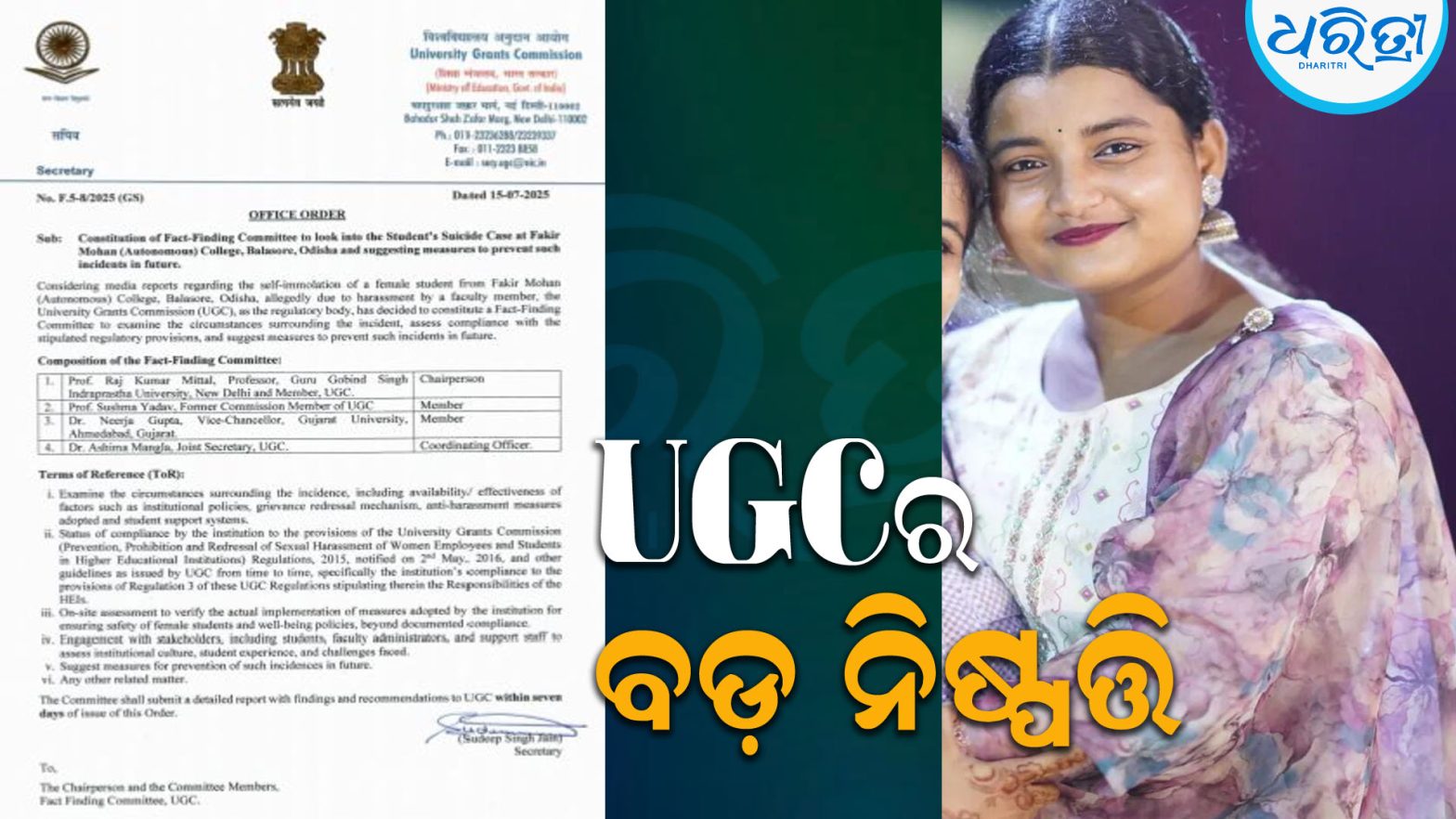ଭୁବନେଶ୍ୱର,୧୫।୭: ବାଲେଶ୍ୱର ଫକୀର ମୋହନ ସ୍ବୟଂଶାସିତ ମହାବିଦ୍ୟାଳୟ ଛାତ୍ରୀ ସୋମ୍ୟାଶ୍ରୀଙ୍କ ମୃତ୍ୟୁ ସାରା ଦେଶକୁ ସ୍ତବ୍ଧ କରିଦେଇଛି। ଏହି ଘଟଣାରେ ବରୋଧୀ ବିଜେଡି ଏବଂ କଂଗ୍ରେସ, ଭାଜପା ସରକାରଙ୍କୁ ଘେରୁଛନ୍ତି। ଘଟଣାକୁ ନେଇ UGC ପକ୍ଷରୁ ଫ୍ୟାକ୍ଟ ଫାଇଣ୍ଡିଂ କମିଟି ଗଠନ କରାଯାଇଛି। ପ୍ରଫେସର ରାଜ ମିତ୍ତଲଙ୍କ ଅଧ୍ୟକ୍ଷତାରେ କମିଟି ଗଠନ ହୋଇଛି। କମିଟିରେ ସୁଷମା ଯାଦବ, ନୀର୍ଜା ଗୁପ୍ତା ଓ ଅସୀମା ମଙ୍ଗଳା ରହିଛନ୍ତି। ଏହି ଆତ୍ମାହୁତି ଘଟଣାରେ ତଦନ୍ତ କରିବ ୪ ଜଣିଆ କମିଟି। ସମସ୍ତ ଦିଗକୁ ଅନୁଧ୍ୟାନ କରି ରିପୋର୍ଟ ଦାଖଲ କରିବ କମିଟି। ୭ ଦିନ ଭିତରେ ୟୁଜିସି ନିକଟରେ ରିପୋର୍ଟ ଦାଖଲ କରିବାକୁ ନିର୍ଦ୍ଦେଶ ଦିଆଯାଇଛି।