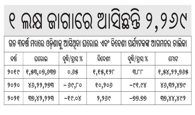 ପର୍ଯ୍ୟଟନ ବିଭାଗରୁ ମିଳିଥିବା ସୂଚନା ଅନୁଯାୟୀ ୨୦୧୯ରେ ରାଜ୍ୟକୁ ୧ ଲକ୍ଷ ୧୫ ହଜାର ୧୨୮ ବିଦେଶୀ ପର୍ଯ୍ୟଟକ ଆସିଥିବା ବେଳେ ୨୦୨୦ରେ ଏହା ୧୦,୨୦୬କୁ ଖସିଯାଇଛି। ସେହିପରି ୨୦୨୧ରେ ବିଦେଶୀ ପର୍ଯ୍ୟଟକଙ୍କ ସଂଖ୍ୟା ୨,୨୬୯କୁ ହ୍ରାସପାଇଛି। କେବଳ ବିଦେଶୀ ନୁହନ୍ତି ଘରୋଇ ପର୍ଯ୍ୟଟକଙ୍କ ସଂଖ୍ୟା ମଧ୍ୟ କମିବାରେ ଲାଗିଛି। ୨୦୧୯ରେ ଓଡ଼ିଶାକୁ ୧,୫୩,୦୭,୬୩୭ ଘରୋଇ ପର୍ଯ୍ୟଟକ ଆସିଥିବା ବେଳେ ୨୦୨୦ରେ ୪୬,୨୨,୨୭୩ ଏବଂ ୨୦୨୧ରେ ୩୭,୪୨,୨୨୩ ପର୍ଯ୍ୟଟକ ଆସିଥିଲେ। ଏପରି କି ପର୍ଯ୍ୟଟନ ଋତୁରେ ମଧ୍ୟ ପର୍ଯ୍ୟଟକ ଆସୁନାହାନ୍ତି। ଏହି ୩ ବର୍ଷରେ ରାଜ୍ୟ ସରକାର ବିଭିନ୍ନ ପର୍ଯ୍ୟଟନ ଉତ୍ସବ, ରୋଡ୍ ଶୋ ଆୟୋଜନ କରି ପ୍ରାୟ ୩୦୦ କୋଟି ଟଙ୍କା ଖର୍ଚ୍ଚ କରିସାରିଲେଣି। ହେଲେ ପର୍ଯ୍ୟଟନ କ୍ଷେତ୍ରରେ ସେପରି ଆଖିଦୃଶିଆ ଉନ୍ନତି ହେଉନାହିଁ। ପର୍ଯ୍ୟଟକଙ୍କ ପାଇଁ ରହଣି ସ୍ଥଳ, ସୁରକ୍ଷା ଏବଂ ନୂଆ ପର୍ଯ୍ୟଟନ ସ୍ଥଳର ବିକାଶ ହେଉ ନ ଥିବାରୁ ରାଜ୍ୟକୁ ପର୍ଯ୍ୟଟକଙ୍କ ଆଗମନ ହ୍ରାସପାଉଛି। ରାଜ୍ୟରେ ପ୍ରାକୃତିକ ସୌନ୍ଦର୍ଯ୍ୟ ଭରି ରହିଛି। ଏହାର ଉପଯୋଗ ହେଉ ନ ଥିବାରୁ ପର୍ଯ୍ୟଟନ ଶିଳ୍ପର ବିକାଶ ହୋଇପାରୁ ନାହିଁ। ପର୍ଯ୍ୟଟନକୁ ନିର୍ଭର କରି ସୃଷ୍ଟି ହେବାକୁ ଥିବା ନିଯୁକ୍ତି ମଧ୍ୟ ବୃଦ୍ଧିପାଉନି। ଏପରି କି ବିଧାନସଭାରେ ବିରୋଧୀ ସଦସ୍ୟମାନେ ପର୍ଯ୍ୟଟନର ବିକାଶକୁ ନେଇ ବାରମ୍ବାର ସରକାରଙ୍କ ଦୃଷ୍ଟି ଆକର୍ଷଣ କରି ଆସୁଛନ୍ତି। ପର୍ଯ୍ୟଟନ ମନ୍ତ୍ରୀ ଅଶ୍ୱିନୀ ପାତ୍ର କହିଛନ୍ତି ଯେ କୋଭିଡ୍ ମହାମାରୀ ପର୍ଯ୍ୟଟନ ଶିଳ୍ପ ଉପରେ ଗଭୀର ପ୍ରଭାବ ପକାଇଛି। ପର୍ଯ୍ୟଟନ କ୍ଷେତ୍ରର ବିକାଶ ପାଇଁ ରାଜ୍ୟ ସରକାର ଇଡ୍କୋ ଜରିଆରେ ହୋଟେଲ ନିର୍ମାଣ ଲାଗି ଘରୋଇ ସଂସ୍ଥାକୁ ଜମି ଯୋଗାଇ ଦେଉଛନ୍ତି।