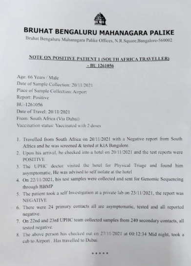 ବେଙ୍ଗାଲୁରୁର ମ୍ୟୁନିସିପାଲଟି ବୃହତ ବେଙ୍ଗାଲୁରୁ ମହାନଗର ପାଳିକା (ବିବିଏମ୍ପି) ଅନୁଯାୟୀ, ନଭେମ୍ବର ୨୦ ତାରିଖରେ ନେଗେଟିଭ କୋଭିଡ୍-୧୯ ରିପୋର୍ଟ ସହ ୬୬ ବର୍ଷୀୟ ବ୍ୟକ୍ତି ଦକ୍ଷିଣ ଆଫ୍ରିକାରୁ ଆସିଥିଲେ। ସେ କରୋନା ଭାଇରସର ଟିକାର ଉଭୟ ଡୋଜ ନେଇ ସାରିଛନ୍ତି। ଏଠାରେ ପହଞ୍ଚିବା ପରେ ସେ ଏକ ହୋଟେଲରେ ରହିଥିଲେ। ସେହି ଦିନ ସେ ପଜିଟିଭ ଥିବା ଜଣାପଡ଼ିଥିଲା। ତାଙ୍କ ନିକଟରେ ଲକ୍ଷଣ ଦେଖାଯାଉ ନ ଥିବାରୁ ସେଲ୍ଫ ଆଇସୋଲେଶନରେ ରହିବାକୁ ପରାମର୍ଶ ଦେଇଥିଲେ ସରକାରୀ ଡାକ୍ତର। ଓମିକ୍ରନ ସଂକ୍ରମିତ ଦେଶରୁ ଫେରିଥିବାରୁ ଦ୍ୱିତୀୟ ଥର ପାଇଁ ତାଙ୍କ ନମୁନା ସଂଗ୍ରହ କରାଯାଇ ୨୨ ତାରିଖରେ ଜେନମ ସିକ୍ୱେନ୍ସିଂ ପାଇଁ ପଠାଯାଇଥିଲା।