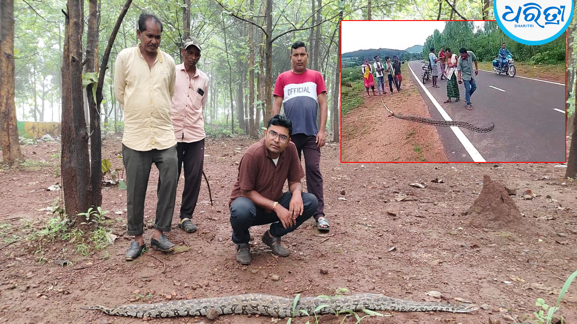 ଥୁଆମୂଳ ରାମପୁର, ୧୭।୮(ଦୁର୍ଗା କୀର୍ତ୍ତି): କଳାହାଣ୍ଡି ଜିଲା ଥୁଆମୂଳ ରାମପୁର ରେଞ୍ଜ ସ୍ଥିତ ଡୁମେର ପଦର ସଦର ଗଉଡ଼ ପଡ଼ା ସ୍କୁଲ ନିକଟର ଏକ ମକା ବାଡ଼ରୁ ପଡ଼ାବାସୀଙ୍କ ସହଯୋଗ ରେ ବନବିଭାଗ ଏକ ବିରାଟ ଅଜଗର ସାପ ଉଦ୍ଧାର କରିଛି। ଉଦ୍ଧାର ସାପ ଟି ର ଲମ୍ବା ପାଖାପାଖି ୬ ରୁ ୭ ଫୁଟ ଏବଂ ଓଜନ ୭.୫ କେଜି ହେବ ବୋଲି ଉଦ୍ଧାରକାରୀ ଦଳ ସୂଚନା ଦେଇଛନ୍ତି ।