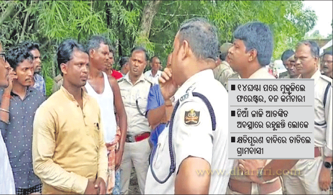 ସୂଚନା ଅନୁଯାୟୀ, କରଞ୍ଜିଆ ବନଖଣ୍ଡ ଅଧୀନ ଦୁଧିଆଣୀ ରେଞ୍ଜରେ ଝାଡ଼ଖଣ୍ଡୀ ହାତୀପଲ ଦୀର୍ଘଦିନ ହେଲା ଆତଙ୍କ ଖେଳାଇ ଚାଲିଛନ୍ତି ା ଘର ଭାଙ୍ଗିବା ସହ ଫସଲ ନଷ୍ଟ କରୁଥିବା ବେଳେ ହାତୀ ହାବୁଡ଼ରେ ପଡ଼ି ଲୋକଙ୍କ ପ୍ରାଣହାନି ଘଟୁଛି। ହାତୀ ଭୟରେ ଲୋକେ ରାତିରେ ଘର ଆଗରେ ନିଅଁା ଜାଳି ଆତଙ୍କିତ ଅବସ୍ଥାରେ ରହୁଛନ୍ତି। ମଙ୍ଗଳବାର ରାତିରେ ପୁରୁଣା ଦେଓଗଁା ନିକଟସ୍ଥ ହଳଦିଆପୋଷି ଗ୍ରାମରେ ହାତୀ ପଶିଥିବା ଖବରପାଇ ଦରି ଫରେଷ୍ଟର ଫାଗୁରାମ ବେଶ୍ରାଙ୍କ ସହ ୧୦ଜଣ ବନ କର୍ମଚାରୀ ସେଠାରେ ପହଞ୍ଚିିଥିଲେ। ବନ କର୍ମଚାରୀମାନଙ୍କୁ ଦେଖି ଗ୍ରାମବାସୀ ହାତୀର ଗତିବିଧି ଉପରେ ବନ ବିଭାଗ ଦୃଷ୍ଟି ଦେଉ ନ ଥିବା କହିବାରୁ କଥା କଟାକଟି ହୋଇଥିଲା। ଶତାଧିକ ଗ୍ରାମବାସୀ ରାତି ୩ଟାରୁ ବୁଧବାର ପୂର୍ବାହ୍ନ ୧୧ଟା ପର୍ଯ୍ୟନ୍ତ ୧୪ଘଣ୍ଟା ଧରି ଫରେଷ୍ଟରଙ୍କ ସହ ବନ କର୍ମଚାରୀଙ୍କୁ ଅଟକ ରଖିଥିଲେ।