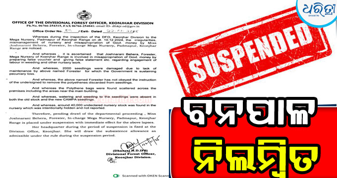 କେନ୍ଦୁଝର,୨୪।୧(ନରେଶ ଚନ୍ଦ୍ର ପଟ୍ଟନାୟକ): କାର୍ଯ୍ୟରେ ଅବହେଳା,ଅନିୟମିତତା,ସରକାରୀ ଅର୍ଥର ଦୂରୁପଯୋଗ ଏବଂ ପରିଚାଳନାଗତ ତ୍ରୁଟି ପାଇଁ କେନ୍ଦୁଝର ସଦର ରେଞ୍ଜ ଅନ୍ତର୍ଗତ ପଦ୍ମପୁର ମେଗା ନର୍ସରୀର ବନପାଳ ଜ୍ୟୋତ୍ସାରାଣୀ ବେହେରାଙ୍କୁ ଡିଏଫଓ ତାଙ୍କ କାର୍ଯ୍ୟାଳୟର ଚିଠି ସଂଖ୍ୟା ୨୫ ତା ୨୨/୦୧/୨୦୨୫ରେ ନିଲମ୍ବିତ କରିଛନ୍ତି। ନିଲମ୍ବନ ପରେ ତାଙ୍କୁ ବନଖଣ୍ଡ କାର୍ଯ୍ୟାଳୟରେ ଯୋଗ ଦେବାକୁ ଆଦେଶ ହୋଇଛି। ନିଲମ୍ବିତ ବନପାଳଙ୍କ ମୁଖ୍ୟ କାର୍ଯ୍ୟାଳୟ କେନ୍ଦୁଝର ଡିଭିଜନ ଅଫିସ ଧାର୍ଯ୍ୟ କରାଯାଇଛି। ପଦ୍ମପୁର ମେଗା ନର୍ସରୀରେ ଶ୍ରମିକ ନିୟୋଜନ କାର୍ଯ୍ୟରେ ସରକାରୀ ଅର୍ଥ ତୋଷାରପାତ କରିବା ସହ ନକଲି ଭାଉଚର,କାଗଜପତ୍ର ଦେଇଥିବା ଯାଂଚ ବେଳେ ଜଣାପଡିଛି।