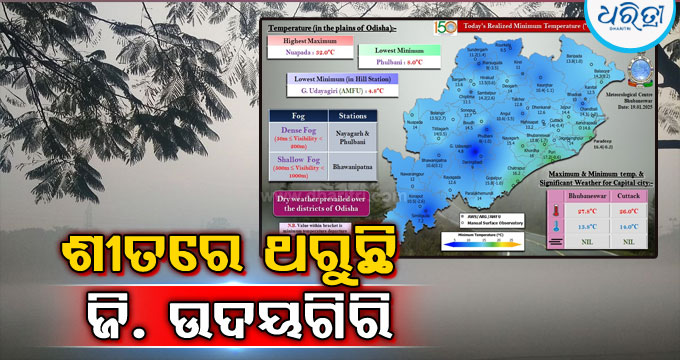 ଜି.ଉଦୟଗିରି,୧୯।୧(ଶିଶିର ପଟ୍ଟନାୟକ): ହାଡ଼ ଭଙ୍ଗା ଶୀତରେ ଥରୁଛି ରାଜ୍ୟର ଶୀତଳ ସହର ଭାବେ ପରିଚିତ ଜି.ଉଦୟଗିରି । ରବିବାର ଏଠାରେ ସର୍ବନିମ୍ନ ତାପମାତ୍ରା ୪. ୮ ଡିଗ୍ରୀ ସେଲସିୟସ ରେକର୍ଡ କରଯାଇଛି। ସେହିପରି ଶନିବାର ସହରର ସର୍ବନିମ୍ନ ତାପମାତ୍ରା ୫ ଡିଗ୍ରୀ ରହିଥିବା ବେଳେ ଶୁକ୍ରବାର ୬ ଡିଗ୍ରୀ ସେଲସିୟସ ରହିଥିଲା। ପ୍ରବଳ ଶୀତର ମଜା ନେବା ପାଇଁ ଏଠାରେ ବାହାର ପର୍ଯ୍ୟଟକମାନଙ୍କ ଭିଡ଼ ଲାଗି ରହୁଛି । ନିକଟରେ କାଲିଗାଡୁ ହିଲଟପ୍ର ବିକାଶ ଓ ସିରିକି ପାର୍କ ଓ ଡ୍ୟାମ୍ର ବିକାଶ ପାଇଁ ପଞ୍ଚାୟତରାଜ ମନ୍ତ୍ରୀ ରବି ନାୟକଙ୍କ ଗସ୍ତ ବେଳେ ଅଞ୍ଚଳ ବାସୀ ପ୍ରସ୍ତାବ ଦେଇଥିଲେ । ଏସବୁ ପର୍ଯ୍ୟଟନସ୍ଥଳୀ ଗୁଡିକର ବିକାଶ ହୋଇ ପାରିଲେ ପର୍ଯ୍ୟଟନ କ୍ଷେତ୍ରରୁ ଅଞ୍ଚଳ ବାସିନ୍ଦା ଲାଭବାନ ହୋଇ ପାରିବେ ବୋଲି କହିଥିଲେ । ଅନ୍ୟପଟେ ଘନ କୁହୁଡ଼ି ଓ ପ୍ରବଳ ଥଣ୍ଡା ଲାଗିରହିଥିବା ଯୋଗୁ ଜନ ଜୀବନ ପ୍ରଭାବିତ ହେଉଛି। ଅନେକେ ଲୋକେ ଥଣ୍ଡା, ସର୍ଦ୍ଦି, ଜ୍ୱରରେ ପୀଡ଼ିତ ହେଉଥିବା ଦେଖାଯାଉଛି।