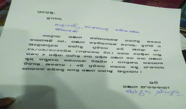 ଗଞ୍ଜାମ,୧୧।୭(ଡି.ଏନ୍.ଏ.) ଗଞ୍ଜାମ ତହସିଲଦାରଙ୍କ କାର୍ଯ୍ୟକୁ ପ୍ରତିବାଦ କରି ସହରବାସୀଙ୍କ ପକ୍ଷରୁ ମଙ୍ଗଳବାର ଗଞ୍ଜାମ ବଜାର ବନ୍ଦ ଡାକରା ଦିଆଯାଇଛି l ହେଲେ ସାନ ବଜାର ବଣିକ ସଙ୍ଘ ବନ୍ଦ ପାଳନରେ ସାମିଲ ହେବ ନାହିଁ। ଏନେଇ ସାନ ବଜାର ବଣିକ ସଭାପତି ସୁଧୀର କୁମାର ପାଢ଼ୀ, ସମ୍ପାଦକ ପ୍ରଭାତ କୁମାର ସାହୁ, କୋଷାଧକ୍ଷ ସନ୍ତୋଷ ଗୌଡ଼ ଗଣମାଧ୍ୟମକୁ ଏହି ସୂଚନା ଦେଇଛନ୍ତି l