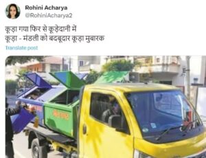ରୋହିଣୀ ସୋସିଆଲ ମିଡିଆ ‘ଏକ୍ସ’ରେ ଲେଖିଛନ୍ତି, ଅଳିଆ ପୁଣି ଅଳିଆ ଗଦାକୁ ଗଲା, ଅଳିଆଗଦାକୁ ଦୁର୍ଗନ୍ଧମୟ ଅଳିଆ ଭଲ ଲାଗେ ।