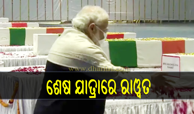 ନୂଆଦିଲ୍ଲୀ.୧୦।୧୨: ତାମିଲନାଡୁର କୁନୁର ନିକଟରେ ହେଲିକପ୍ଟର ଦୁର୍ଘଟଣାରେ ମୃତ୍ୟୁବରଣ କରିଥିବା ଦେଶର ପ୍ରଥମ ସିଡିଏସ୍‌ ବିପିନ ରାୱତଙ୍କୁ ଆଜି ଅନ୍ତିମ ସଂସ୍କାର କରାଯିବ। ରାୱତଙ୍କୁ ୧୭ ତୋପ ସଲାମି ଦିଆଯିବ ଏବଂ ଶେଷ ରୀତିନୀତିରେ ୮୦୦ ସେନା କର୍ମଚାରୀ ଉପସ୍ଥିତ ରହିବେ। ଜେନେରାଲ ରାୱତ ଏବଂ ତାଙ୍କ ସ୍ତ୍ରୀଙ୍କ ମୃତଦେହ ଶୁକ୍ରବାର ସକାଳ ୧୦ଟାରୁ ଶେଷ ଦର୍ଶନ ପାଇଁ ରଖାଯାଇଛି।