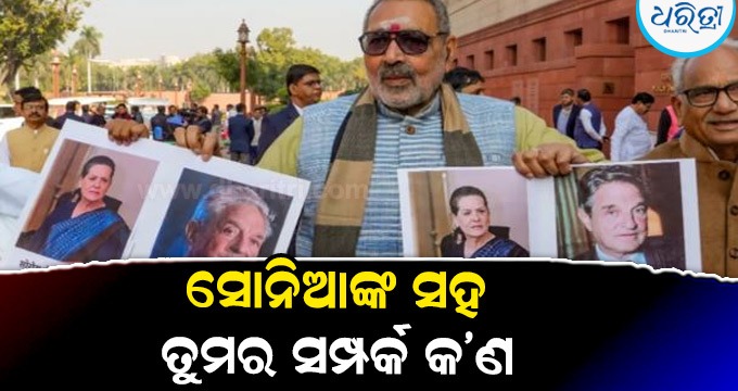 ସଂସଦ କମ୍ପ୍ଲେକ୍ସରେ ଭାଜପା ନେତା ବରିଷ୍ଠ କଂଗ୍ରେସ ନେତା ସୋନିଆ ଗାନ୍ଧୀ ଏବଂ ଜର୍ଜ ସୋରୋସଙ୍କ ପୋଷ୍ଟର ଦେଖାଇଛନ୍ତି। ଏହି ପୋଷ୍ଟରରେ ଲେଖାଯାଇଥିଲା – ‘ସୋରୋସଙ୍କ ସହିତ ତୁମର ସମ୍ପର୍କ କ’ଣ, ସୋନିଆ ଦୟାକରି ଉତ୍ତର ଦିଅ ।’ ଗିରିରାଜ ଅନ୍ୟ ହାତରେ ଆଉ ଏକ ପୋଷ୍ଟର ଧରିଥିଲେ। ଏଥିରେ ଲେଖାଯାଇଥିଲା- ‘ଏହି ସମ୍ପର୍କକୁ କ’ଣ କୁହାଯାଏ?’