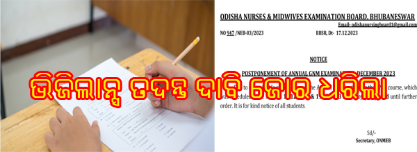 ପ୍ରୋଗ୍ରାମ ଅନୁସାରେ ଡିସେମ୍ବର ୧୧ରୁ ୧୯ତାରିଖ ମଧ୍ୟରେ ଏଏନ୍ଏମ୍ ଏବଂ ଜିଏନ୍ଏମ୍ ଛାତ୍ରୀଛାତ୍ରମାନେ ପରୀକ୍ଷା ଦେବାର ଥିଲା। ହେଲେ ରବିବାର ବୋର୍ଡ ପକ୍ଷରୁ ନୋଟିସ ନଂ. ୯୪୭/ଏନ୍ଇବି-୩/୨୦୨୩ ଅନୁସାରେ ୧୮ ଏବଂ ୧୯ ତାରିଖରେ ହେବାକୁ ଥିବା ଜିଏନ୍ଏମ୍ ପରୀକ୍ଷାକୁ ବନ୍ଦ କରାଯାଇଛି l