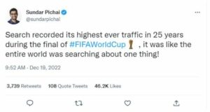 ଆଲଫାବେଟ ଏବଂ ଗୁଗଲର ସିଇଓ ସୁନ୍ଦର ପିଚାଇ ଡିସେମ୍ବର ୧୯ ରେ ସୋମବାର ତାଙ୍କ ଅଫିସିଆଲ ଟୁଇଟର ପୋଷ୍ଟରେ କହିଛନ୍ତି ଯେ ଫିଫା ବିଶ୍ୱକପ ଫାଇନାଲ ସମୟରେ ଗୁଗଲ ସର୍ଚ୍ଚ ଏହାର ୨୫ ବର୍ଷ ମଧ୍ୟରେ ସର୍ବାଧିକ ଟ୍ରାଫିକ ରେକର୍ଡ କରିଛି। ପିଚାଇ ଟୱିଟ କରି କହିଛନ୍ତି ଯେ # FIFAWorldCup ସର୍ଚ୍ଚର ଫାଇନାଲ ସମୟରେ ସର୍ବାଧିକ ଟ୍ରାଫିକ ରେକର୍ଡ ହୋଇଥିଲା। ଏହା ଅନୁଭବ ହୋଇଥିଲା ଯେ ସମଗ୍ର ବିଶ୍ୱ ଗୋଟିଏ ଜିନିଷ ଖୋଜୁଛି।