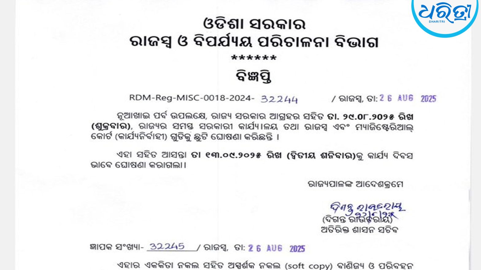 ଭୁବନେଶ୍ୱର,୨୬।୮: ୨୯ ତାରିଖକୁ ସରକାରୀ ଛୁଟି ଘୋଷଣା ହୋଇଛି। ରାଜସ୍ବ ଓ ବିପର୍ଯ୍ୟୟ ପରିଚାଳନା ବିଭାଗ ପକ୍ଷରୁ ବିଜ୍ଞପ୍ତି ଜାରି ହୋଇଛିି।ନୂଆଖାଇ ପର୍ବ ଉପଲେକ୍ଷେ ୨୯ ତାରିଖ ଛୁଟି ରହିବ। ସବୁ ସରକାରୀ କାର୍ଯ୍ୟାଳୟ, ମାଜିଷ୍ଟେରିଆଲ କୋର୍ଟ ଛୁଟି ରହିବ। ଏଥିପାଇଁ ସେପ୍ଟେମ୍ବର ୧୩ ଦ୍ବିତୀୟ ଶନିବାର କାର୍ଯ୍ୟଦିବସ ଘୋଷଣା ହୋଇଛି।