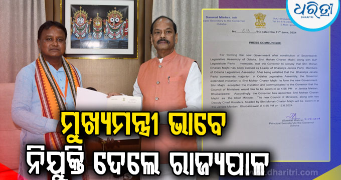 ଭୁବନେଶ୍ୱର,୧୧।୬: ଓଡ଼ିଶାର ମୁଖ୍ୟମନ୍ତ୍ରୀ ଭାବେ ବୁଧବାର ଅପରାହ୍ନରେ ଶପଥ ନେବ ମୋହନ ସରକାର। ଏନେଇ ରାଜଭବନ ପକ୍ଷରୁ ବିଧିବଦ୍ଧ ସୂଚନା ଦିଆଯାଇଛି। ଭୁବନେଶ୍ୱର ଜନତା ମଇଦାନରେ ୪.୫୫ରେ ଶପଥଗ୍ରହଣ ସମାରୋହ ଅନୁଷ୍ଠିତ ହେବ। ତେବେ ଏହାପୂର୍ବରୁ ମୋହନ ମାଝୀଙ୍କୁ ମୁଖ୍ୟମନ୍ତ୍ରୀ ଭାବେ ରାଜ୍ୟପାଳ ନିଯୁକ୍ତି ଦେଇଛନ୍ତି।