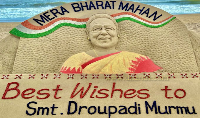 ପୁରୀ ଅଫିସ,୨୧।୭: ଏନ୍ଡିଏ ପ୍ରାର୍ଥୀ ଦ୍ରୌପଦୀ ମୁର୍ମୁ ଭାରତର ପରବର୍ତ୍ତୀ ରାଷ୍ଟ୍ରପତି ହେବା ଏକ ପ୍ରକାର ସ୍ପଷ୍ଟ ହୋଇଥିଲେ ହେଁ ଚୂଡ଼ାନ୍ତ ଫଳାଫଳ ପ୍ରକାଶକୁ ଅପେକ୍ଷା ରହିଛି। ଗୁରୁବାର ନିର୍ବାଚନର ଗଣତି ଜାରି ରହିଥିବା ବେଳେ ସାରା ରାଜ୍ୟରେ ଉତ୍ସବର ବାତାବରଣ ଦେଖିବାକୁ ମିଳୁଛି। ଏହି କ୍ରମରେ ଆନ୍ତର୍ଜାତୀୟ ବାଲୁକା ଶିଳ୍ପୀ ପଦ୍ମଶ୍ରୀ ସୁଦର୍ଶନ ପଟ୍ଟନାୟକ ନିଜର କଳା ମାଧ୍ୟମରେ ଦ୍ରୌପଦୀଙ୍କୁ ଶୁଭେଚ୍ଛା ଜଣାଇଛନ୍ତି। ପୁରୀ ବେଳାଭୂମିରେ ସେ ତାଙ୍କର ଏକ ବାଲୁକା କଳା ସହ ଇଂରାଜୀରେ ‘ମେରା ଭାରତ ମହାନ। ବେଷ୍ଟ ଉଇସେସ୍ ଟୁ ଶ୍ରୀମତି ଦ୍ରୌପଦୀ ମୁର୍ମୁ’ ବୋଲି ଲେଖିଛନ୍ତି।