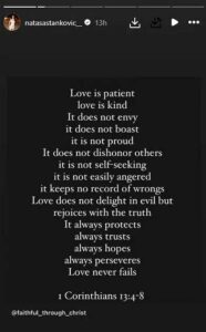 ଯଦିଓ ନତାଶା ଏପର୍ଯ୍ୟନ୍ତ ସର୍ବସାଧାରଣରେ ଏହାର କାରଣ ବିଷୟରେ କହିନାହାଁନ୍ତି, କିନ୍ତୁ ସେ ଇନଷ୍ଟାଗ୍ରାମ ଷ୍ଟୋରୀରେ ଏକ ପୋଷ୍ଟ ଶେୟାର କରି ପ୍ରେମ କିପରି ହେବା ଉଚିତ ଏବଂ ଏହା କିପରି ହେବା ଉଚିତ ନୁହେଁ ସେ ବିଷୟରେ ବର୍ଣ୍ଣନା କରିଛନ୍ତି। ନୋଟରେ ଲେଖାଥିଲା, ପ୍ରେମ ଧୈର୍ଯ୍ୟବାନ ଏବଂ ଦୟାଳୁ ଅଟେ। ଏହା ଈର୍ଷାପରାୟଣ ହେବା ଉଚିତ୍ ନୁହେଁ। ଏହା ଅନ୍ୟମାନଙ୍କୁ ଅପମାନିତ କରେ ନାହିଁ। ଏହା ସ୍ବାର୍ଥପର ନୁହେଁ। ଏହା ସହଜରେ କ୍ରୋଧିତ ହୁଏ ନାହିଁ। ଏହା ଭୁଲକୁ ସହ୍ୟ କରେ ନାହିଁ। ଏହା ସର୍ବଦା ସୁରକ୍ଷା କରେ।