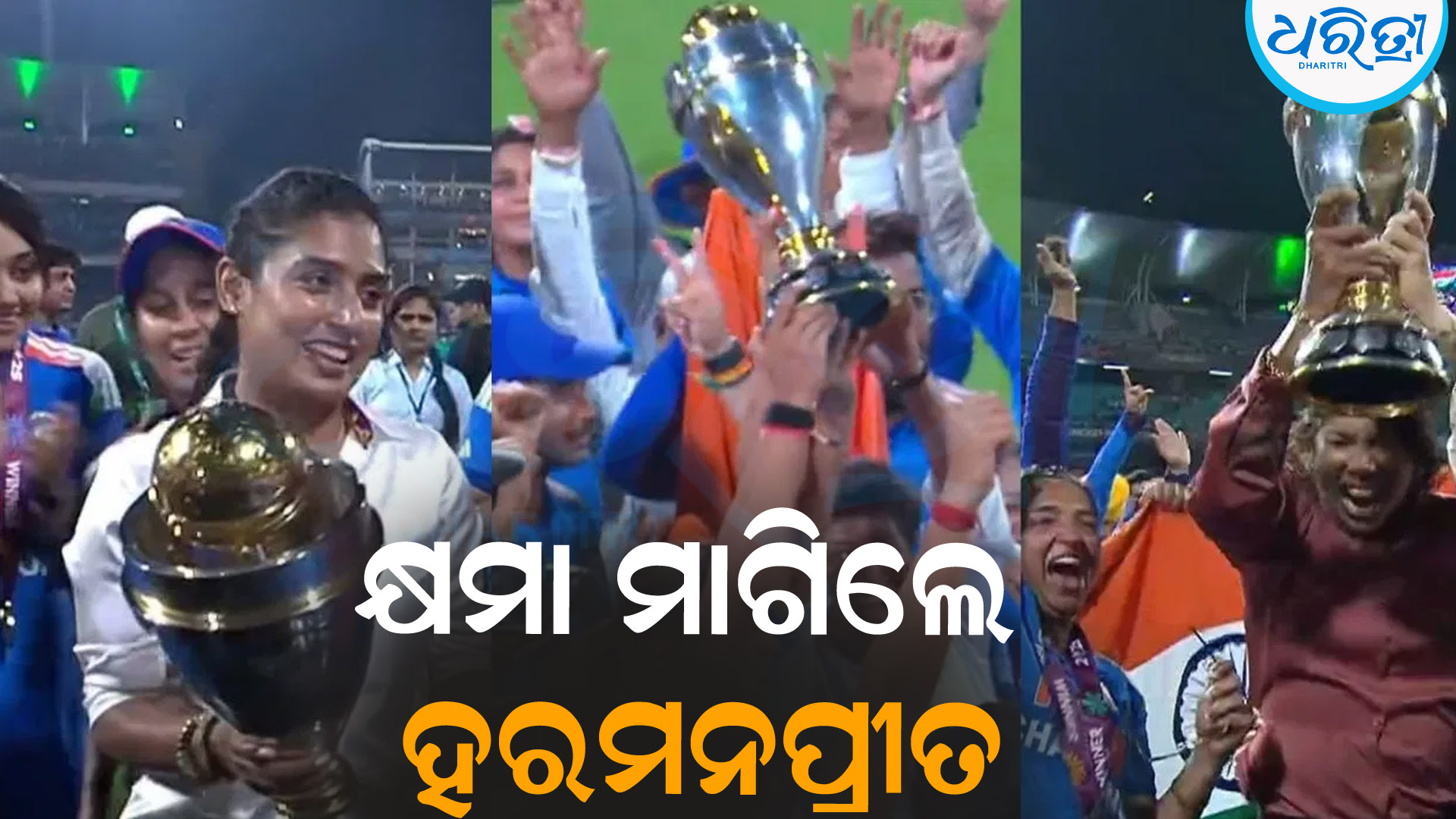 ନଭି ମୁମ୍ବାଇ,୩।୧୧: ଭାରତୀୟ ମହିଳା ଦଳର ବିଶ୍ୱକପ ଜିତିବାର ସ୍ବପ୍ନ ଶେଷରେ ନଭି ମୁମ୍ବାଇର ଡିୱାଇ ପାଟିଲ ଷ୍ଟାଡିୟମରେ ସାକାର ହୋଇଛି। ଫାଇନାଲରେ ଦକ୍ଷିଣ ଆଫ୍ରିକାକୁ ପରାସ୍ତ କରିବା ପରେ, ଭାରତୀୟ ଦଳର ଖେଳାଳିମାନେ ସେଲିବ୍ରେଶନ କରିଥିଲେ। ଏହି ସେଲିବ୍ରେଶନରେ ପୂର୍ବତନ ଭାରତୀୟ ମହିଳା ଖେଳାଳିମାନଙ୍କୁ ମଧ୍ୟ ସାମିଲ କରିଥିଲେ। ଅଧିନାୟକ ହରମନପ୍ରୀତ କୌର ଏହି କିମ୍ବଦନ୍ତୀ ଖେଳାଳିମାନଙ୍କୁ ଟ୍ରଫି ପ୍ରଦାନ କରି କହିଥିଲେ, ଦିଦି ଏହା ତୁମ ପାଇଁ ଥିଲା। ଭାରତୀୟ ଅଧିନାୟକ କାହାକୁ କ୍ଷମା ମଧ୍ୟ ମାଗିଥିଲେ। ଏହାର ଭିଡିଓ ସୋସିଆଲ ମିଡିଆରେ ଭାଇରାଲ ହେଉଛି।