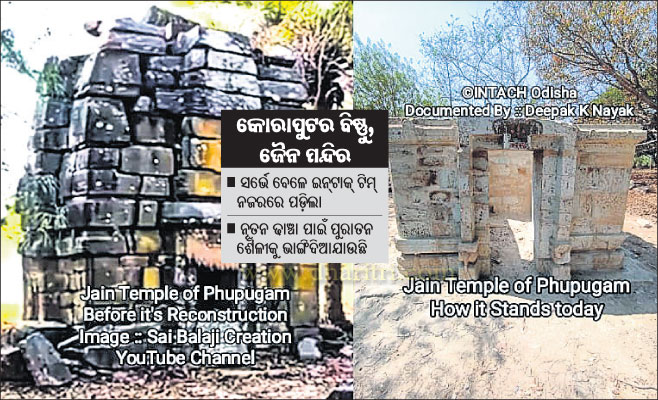 ଇନ୍ଟାକର ପ୍ରକଳ୍ପ ସଂଯୋଜକ ତଥା ବିଶିଷ୍ଟ ଐତିହାସିକ ଅନିଲ ଧୀରଙ୍କ ସମେତ ଗବେଷକ ଦୀପକ କୁମାର ନାୟକ, ବିକ୍ରମ ନାୟକ, କୋରାପୁଟର ସଦସ୍ୟ ସଞ୍ଜୀବ ହୋତା, ଏବଂ ଅଜିତ ପାତ୍ରଙ୍କୁ ନେଇ ଗଠିତ ଏକ ଟିମ୍ ନିକଟରେ କୋରାପୁଟରେ ଏକ ଐତିହ୍ୟ ସର୍ଭେ କରିବା ସମୟରେ ଏହା ନଜରକୁ ଆସିଥିଲା। ଜିଲା ପ୍ରଶାସନ ପକ୍ଷରୁ ଉକ୍ତ ୨ମନ୍ଦିରକୁ ସଂରକ୍ଷଣ କରାଯାଇ ମରାମତି ସହ ପୁନରୁଦ୍ଧାର କରାଯାଉଛି। ହେଲେ ଉକ୍ତ ପୁରାତନ ବିଷ୍ଣୁ ମନ୍ଦିରଟି ନଷ୍ଟ ହୋଇଯାଇଥିବା ବେଳେ ନୂତନ ଢାଞ୍ଚାରେ କରିବା ପାଇଁ ପ୍ରାଚୀନ ଗଠନ ଶୈଳକୁ ଭାଙ୍ଗି ଦିଆଯାଇଛି। ପୂର୍ବ ମନ୍ଦିରର ସମସ୍ତ ଖୋଦେଇ ଓ ଅଳଙ୍କାର ସମ୍ପୂର୍ଣ୍ଣ ନଷ୍ଟ ହୋଇଯାଇଥିଲା। ଯାହାସବୁ ନୂତନ ଶୈଳୀରେ ମନ୍ଦିର ଗଠନ କରାଯାଉଛି, ତାହା ପୂର୍ବ ମନ୍ଦିର ସହିତ କୌଣସି ସମାନତା ରହୁ ନ ଥିଲା। ଏପରିକି ପୁରାତନ ଚତୁର୍ଭୁଜ ବିଷ୍ଣୁ ପ୍ରତିମୂର୍ତ୍ତିକୁ ପୁରାତନ ମନ୍ଦିରରୁ ହଟାଇ ଅବହେଳିତ ଭାବେ ଖୋଲା ସ୍ଥାନରେ ରଖାଯାଇଥିଲା। କେବଳ ଦୁଇଟି ଖୋଦିତ କବାଟ ବ୍ୟତୀତ ଅନ୍ୟ ସାଜସଜ୍ଜା ମୂର୍ତ୍ତି ନଷ୍ଟ ହୋଇଯାଇଛି। ସେହିପରି ବିଶିଷ୍ଟ ଗଜଲକ୍ଷ୍ମୀ ମୂର୍ତ୍ତି ସହିତ କବାଟ ଦ୍ୱାର ପରିତ୍ୟକ୍ତ ଅବସ୍ଥାରେ ପଡ଼ିଛି। ଏଥିସହ କିଛି ପ୍ରାଚୀନ ପଥରଗୁଡ଼ିକୁ ସ୍ଥାନୀୟ ଲୋକ ନେଇଯାଇଥିବା ଜଣାପଡ଼ିଥିଲା। ସେହିଭଳି ବିଷ୍ଣୁ ମନ୍ଦିରଠାରୁ ମାତ୍ର ୩ କି.ମି. ଦୂରରେ ଥିବା ଫୁଫୁଗଁାର ଜୈନ ମନ୍ଦିରରେ ମଧ୍ୟ ଅଧା ମରାମତି ହୋଇଛି। ଏହି ମନ୍ଦିର ମଧ୍ୟ ଏକ ପ୍ରାରମ୍ଭିକ କଳିଙ୍ଗନ ସମୟର, ଯାହାକି ଷଷ୍ଠ-ସପ୍ତମ ଶତାବ୍ଦୀରେ ନିର୍ମିତ ହୋଇଥାଇପାରେ। ଏଠାରେ ମଧ୍ୟ ମୂଳ ଗଠନକୁ ଭାଙ୍ଗି ଦିଆଯାଇଥିବାବେଳେ ପଥର ଖଣ୍ଡଗୁଡ଼ିକ ବିପର୍ଯ୍ୟସ୍ତ ହୋଇପଡ଼ିଛି। ପୁନରୁଦ୍ଧାର ନାମରେ ଉଭୟ ମନ୍ଦିର କିପରି ନଷ୍ଟ ହୋଇଯାଇଛି ତାହା କାର୍ଯ୍ୟରୁ ସ୍ପଷ୍ଟ ଉଲ୍ଲେଖ ହେଉଛି।