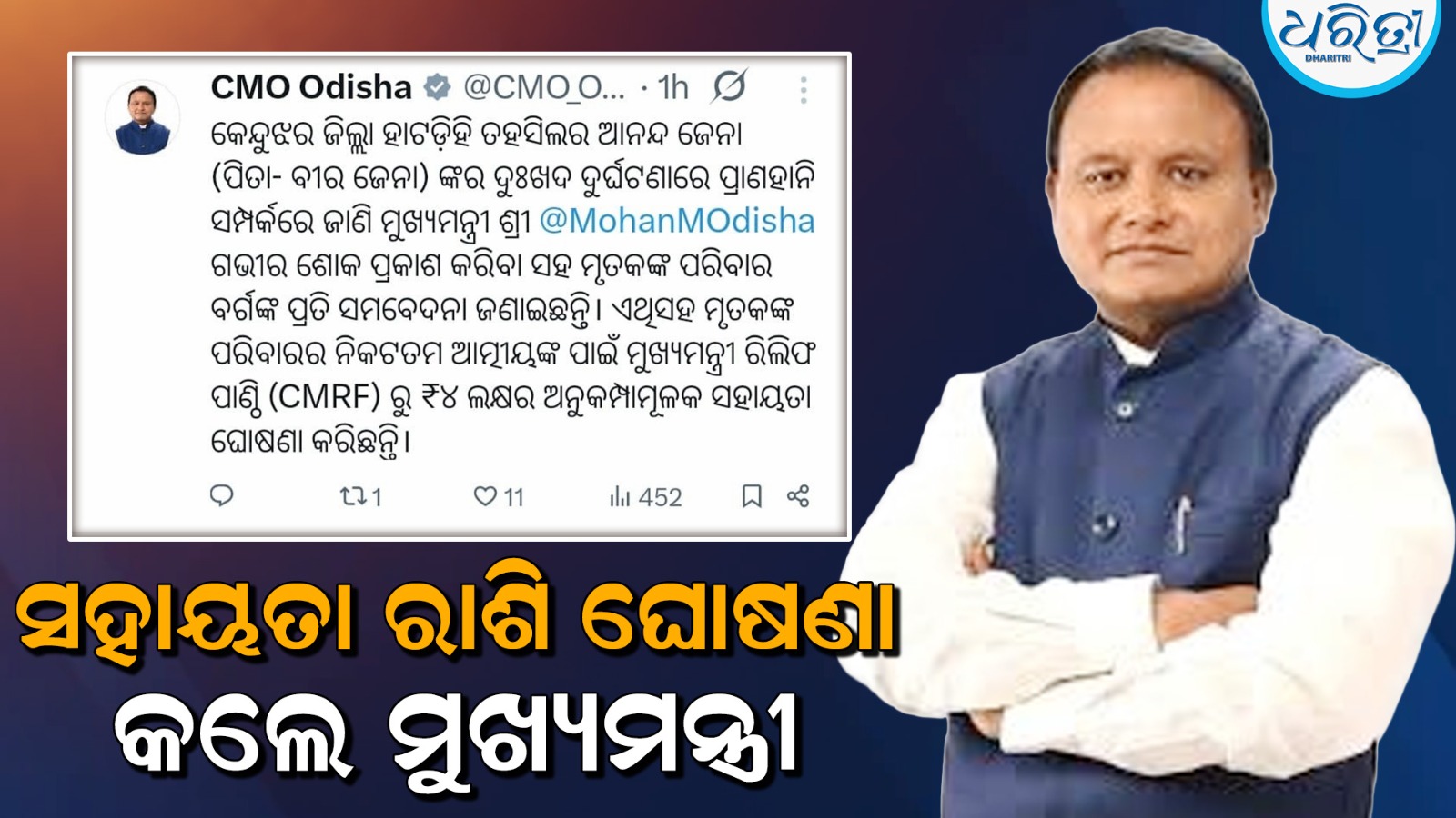 ହାଟଡିହୀ,୨୬।୧(ଶୁଭକାନ୍ତ ନାୟକ): କେନ୍ଦୁଝର ଜିଲା ହାଟଡିହୀ ବ୍ଲକ ବିଷ୍ଣୁପୁର ଗ୍ରାମର ଆନନ୍ଦ ଯେନା(୫୮) ରବିବାର ହାଇୱା ଧକ୍କାରେ ମୃତ୍ୟୁ ଘଟିଥିଲା। ମୃତକଙ୍କ ପରିବାର ବର୍ଗକୁ ମୁଖ୍ୟମନ୍ତ୍ରୀ ମୋହନ ଚରଣ ମାଝୀ ସମବେଦନା ଜଣାଇବା ସହ ଶୋକ ପ୍ରକାଶ କରିଛନ୍ତି। ଏଥିସହ ମୁଖ୍ୟମନ୍ତ୍ରୀ ରିଲିଫ ପାଣ୍ଠିରୁ ୪ ଲକ୍ଷ ଟଙ୍କାର ଅନୁକମ୍ପା ମୂଳକ ସହାୟତା ଘୋଷଣା କରିଛନ୍ତି ।କ୍ଷତିପୂରଣ ପ୍ରଦାନ ଏବଂ ବାଲି ପରିବହନରେ କଟକଣା ଦାବିରେ ମୃତଦେହ ରଖି ରାସ୍ତାରୋକୋ ଆନ୍ଦୋଳନ ସୋମବାର ପ୍ରତ୍ୟାହୃତ ହୋଇଛି । ଏଥିସହ ଦୁର୍ଘଟଣା ଘଟାଇଥିବା ହାଇୱା ମାଲିକ ମୃତକଙ୍କ ପରିବାରକୁ ଅଢେଇ ଲକ୍ଷ ଟଙ୍କା ସହାୟତା ପ୍ରଦାନ କରିଥିବା ଆନନ୍ଦପୁର ଉପଜିଲାପାଳ ନୀଳମାଧବ ସୁନା ଏବଂ ନନ୍ଦିପଦା ଥାନା ଅଧିକାରୀ ଧର୍ମେନ୍ଦ୍ର ଶାନ୍ତି ପ୍ରକାଶ କରିଛନ୍ତି ।