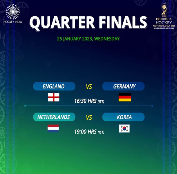 ଭୁବନେଶ୍ୱର, ୨୫ା୧(କ୍ରୀଡ଼ା ପ୍ରତିନିଧି): ଚଳିତ ହକି ବିଶ୍ୱକପ୍ର ତୃତୀୟ ଓ ଚତୁର୍ଥ କ୍ୱାର୍ଟର ଫାଇନାଲ ବୁଧବାର କଳିଙ୍ଗ ଷ୍ଟାଡିୟମରେ ଅନୁଷ୍ଠିତ ହେବ। ତୃତୀୟ କ୍ୱାର୍ଟରରେ ଇଂଲଣ୍ଡକୁ ଭେଟିବ ଜର୍ମାନୀ। ଚତୁର୍ଥ କ୍ୱାର୍ଟର ଫାଇନାଲରେ ନେଦରଲାଣ୍ଡ୍ସ ଓ ଦକ୍ଷିଣ କୋରିଆ ମଧ୍ୟରେ ମୁକାବିଲା ହେବ।