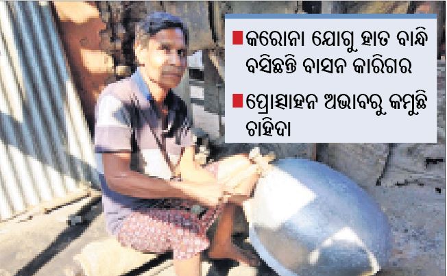 କଠିନ ପରିଶ୍ରମ କରି ହାତରେ ଆଲୁମିନିୟମକୁ ପିଟି ପିଟି ଡେକ୍ଚି ଓ ଅନ୍ୟାନ୍ୟ ସାମଗ୍ରୀ ପ୍ରସ୍ତୁତ କରୁଥିବା କାରିଗର ଉଚିତ ମୂଲ୍ୟ ପାଉ ନ ଥିବାରୁ ଆଉ ଆଗଭଳି ଆଗ୍ରହ ପ୍ରକାଶ କରୁନାହାନ୍ତି। କଞ୍ଚାମାଲର ଅଭାବ, କୋଇଲା ଓ କଞ୍ଚାମାଲର ମୂଲ୍ୟ ବୃଦ୍ଧି, ବିକ୍ରିବଟା ପାଇଁ ବଜାରର ଅଭାବ ଯୋଗୁ ଏହି ବହୁ ପୁରାତନ କାରିଗରି ବନ୍ଦ ହେବାକୁ ବସିଛି। ତେବେ ଅନେକ ପୁରୁଖା କାରିଗର କଷ୍ଟସାଧ୍ୟ ହେଲେ ମଧ୍ୟ ଏହି କୌଳିକ ବୃତ୍ତିକୁ ଛାଡ଼ି ପାରିନାହାନ୍ତି। ଧାର କରଜ କରି କଞ୍ଚା ମାଲ ଆଣି ବାସନକୁସନ ପ୍ରସ୍ତୁତ କରୁଛନ୍ତି। ପୂର୍ବରୁ ବହୁ ପରିବାର ଏହି ବୃତ୍ତିକୁ ଆପଣାଇ ଆସୁଥିଲେ। ଏବେ ହାତ ଗଣତି କେତେକ ଘରେ ଏହା ଦେଖିବାକୁ ମିଳୁଛି। କେନ୍ଦୁଝର ସହରରୁ ଏହି ବାଟ ଦେଇ ପୁରୁଣା ସହର ଗଲେ ଆପେ ଆପେ ଡେକ୍ଚି ପ୍ରସ୍ତୁତ ଶବ୍ଦ ଶୁଣି ଜାଣି ପାରି ଡେକ୍ଚି କିଣିବାକୁ ଆସିଥାନ୍ତି। ଏବେ କରୋନା କଟକଣା ଯୋଗୁଁ ସବୁ କିଛି ଠପ୍ ହୋଇଯାଇଥିବାରୁ ସେମାନେ ଚିନ୍ତାରେ ରହିଥିବା ଉକ୍ତ ସାହିର ଆଇନଜୀବୀ ସନ୍ତୋଷ ସାହୁ କହିଛନ୍ତି। ଏବେ ପରିଶ୍ରମର ଫଳ ମିଳୁନାହିଁ। ନିଆଁ ଗରମରେ ଖଟୁଛୁ। ମଜୂରୀ ମିଳୁନାହିଁ। ମହାଜନ ପୁରୁଣା ମାଲ ଆଣି ଦେଲେ ତାହାକୁ ତରଳାଇ ପ୍ଲେଟ ତିଆରି ହୁଏ। ସେଥିରୁ ପିଟି ପିଟି ବାସନ ତିଆରି ହୁଏ ବୋଲି କାରିଗର ପ୍ରସନ୍ନ ସାହୁ କୁହନ୍ତି। ସୋସାଇଟି ନାହିଁ। ସାମଗ୍ରୀ ରଖିବା ପାଇଁ ଜାଗା ନାହିଁ। ସରକାରୀ ସହାୟତା ମଧ୍ୟ ମିଳୁନାହିଁ। ବାହାର ଜିଲା ଓ ଝାଡ଼ଖଣ୍ଡ ରାଜ୍ୟର ବିଭିନ୍ନ ସ୍ଥାନ ହାଟ ବୁଲି ବୁଲି ବିକିଆସୁଥିବା କହିଛନ୍ତି।