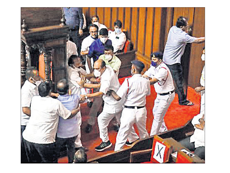 ବେଙ୍ଗାଲୁରୁ,୧୬ା୧୨(ପି.ଟି.); କର୍ନାଟକ ବିଧାନ ପରିଷଦରେ ମଙ୍ଗଳବାର ହାଇଡ୍ରାମା ଦେଖିବାକୁ ମିଳିଛି। ଅନାସ୍ଥା ପ୍ରସ୍ତାବକୁ ନେଇ ଶାସକ ଭାଜପା ସହ ବିରୋଧୀ ଧର୍ମନିରପେକ୍ଷ ଜନତା ଦଳ (ଜେଡିଏସ୍) ଏବଂ କଂଗ୍ରେସ ସଦସ୍ୟମାନେ ପରସ୍ପରକୁ ଟଣାଓଟରା କରି ଧସ୍ତାଧସ୍ତି ହୋଇଥିଲେ। ବିରୋଧୀ ସଦସ୍ୟମାନେ ଉପବାଚସ୍ପତିଙ୍କୁ ତାଙ୍କ ଆସନରୁ ତଳକୁ ଟାଣିଥିଲେ। ହଟ୍ଟଗୋଳ ଓ ଅଚଳାବସ୍ଥା ମଧ୍ୟରେ ପରିଷଦର ଅନେକ ବରିଷ୍ଠ ସଦସ୍ୟ ଏହାକୁ ଅଭୂତପୂର୍ବ କଳଙ୍କିତ ଅଧ୍ୟାୟ ଭାବେ ଅଭିହିତ କରିଥିଲେ। ଶେଷରେ ଗୃହକୁ ଅନିର୍ଦ୍ଦିଷ୍ଟ କାଳ ପାଇଁ ମୁଲତବୀ ଘୋଷଣା କରାଯାଇଛି। ଉଭୟ ଭାଜପା ଏବଂ ଜେଡିଏସ୍ ରାଜ୍ୟପାଳ ଭଜୁଭାଇ ଭାଲାଙ୍କ ହସ୍ତକ୍ଷେପ ଲୋଡ଼ିଛନ୍ତି। ପ୍ରକାଶ ଯେ, ଭାଜପା ସଦସ୍ୟମାନଙ୍କ ପକ୍ଷରୁ ଆଗତ ଅନାସ୍ଥା ପ୍ରସ୍ତାବ ମଙ୍ଗଳବାର କାର୍ଯ୍ୟସୂଚୀରେ ସ୍ଥାନ ପାଇ ନ ଥିଲା। ଗୃହର ଅଧ୍ୟକ୍ଷ କେ. ପ୍ରତାପଚନ୍ଦ୍ର ସେଟ୍ଟି ପ୍ରସ୍ତାବରେ ତାଙ୍କ ବିରୋଧରେ ନିର୍ଦ୍ଦିଷ୍ଟ ଭାବେ କିଛି ଅଭିଯୋଗ ନ ଥିବା ଦର୍ଶାଇ ଏହାକୁ ଖାରଜ କରିଦେଇଥିବାରୁ ଏଭଳି ଅଚଳାବସ୍ଥା ସୃଷ୍ଟି ହୋଇଥିଲା।