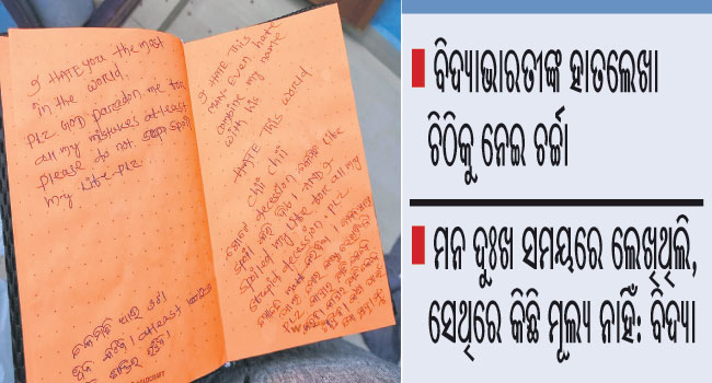 ପାରଳାଖେମୁଣ୍ଡି ସ୍ଥିତ ସୌମ୍ୟଙ୍କ ସରକାରୀ କ୍ୱାର୍ଟର୍ସରୁ ଜବତ ହୋଇଥିବା ଏହିି ଚିଠିରେ ଆହୁରି ମଧ୍ୟ ଲେଖା ହୋଇଛି, ହେ ପ୍ରଭୁ ସବୁ ଭୁଲ୍ କ୍ଷମାକର। ମୋ ଜୀବନକୁ ନଷ୍ଟ କରନାହିଁ। ମୁଁ କାହାର କିଛି ଦୋଷ କରିନାହିଁ। ଗୋଟିଏ ଭୁଲ ନିଷ୍ପତ୍ତି କେମିିତି ଜୀବନକୁ ନଷ୍ଟ କରିଦିଏ। ପ୍ଲିଜ୍ ମୋତେ କ୍ଷମା କରିଦିଅ। ଜୀବନ ସାରା ପାଇଁ କଷ୍ଟ ଦେଖିପାରିବି ନାହିଁ। ତେବେ ବିଦ୍ୟାଭାରତୀ କାହା ଉଦ୍ଦେଶ୍ୟରେ ଏହି ଚିଠି ଲେଖିଥିଲେ ତାହା ସନ୍ଦେହ ଘେରରେ ଥିବା ବେଳେ ଏହି ଚିଠିରୁ ସୌମ୍ୟଙ୍କ ମୃତ୍ୟୁର ରହସ୍ୟ ଜଣାପଡ଼ିବ ବୋଲି କୁହାଯାଉଛି। ଉଲ୍ଲେଖଯୋଗ୍ୟ ଯେ, ଗତ ୧୨ ତାରିଖରେ ସୌମ୍ୟରଞ୍ଜନ ତାଙ୍କ ସରକାରୀ ବାସଭବନରେ ପୋଡ଼ି ହୋଇ ଗୁରୁତର ହୋଇ ପଡ଼ିଥିଲେ। ପରଦିନ ଚିକିତ୍ସାଧିନ ଅବସ୍ଥାରେ ତାଙ୍କର ମୃତ୍ୟୁ ଘଟିଥିଲା। ତେବେ ଜବତ ହାତଲେଖା ଚିଠିରେ ୧୨ରୁ ୧୫ ତାରିଖ ପରେ ଶାନ୍ତିରେ ରହିବି ବୋଲି ଯାହା ଉଲ୍ଲେଖ ରହିଛି ତାହାକୁ ନେଇ ପ୍ରଶ୍ନବାଚୀ ସୃଷ୍ଟି ହୋଇଛି।