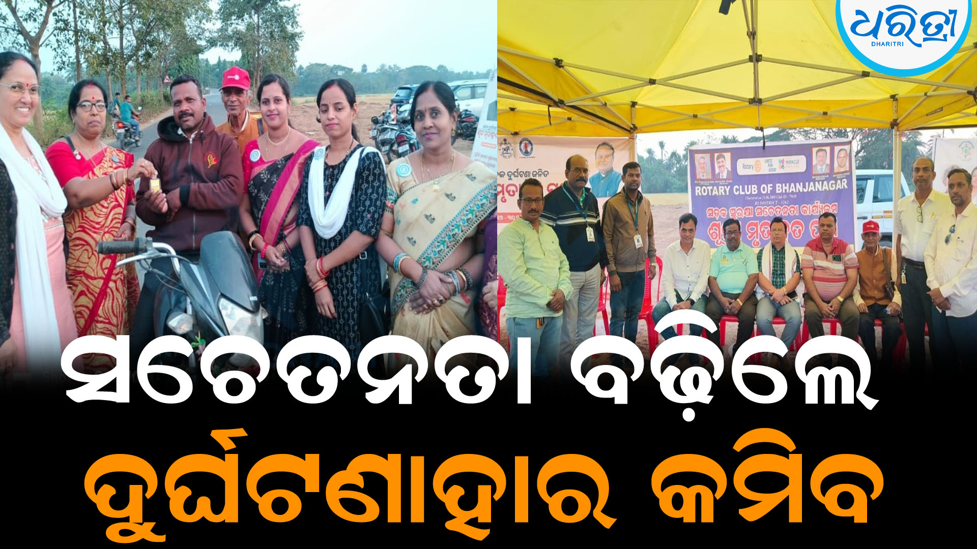 ଭଞ୍ଜନଗର,୨୯/୧୧(ବାବୁଲା ପ୍ରଧାନ):ଗଞ୍ଜାମ ଜିଲା ଭଞ୍ଜନଗର ରୋଟାରୀ କ୍ଲବ ପକ୍ଷରୁ ଭଞ୍ଜନଗର ବେଲଗୁଣ୍ଠା ରୋଡ ନୂଆଗାଁ ସେତୁ ଉପରେ ଶୂନ୍ୟ ମୃତାହତ ପକ୍ଷ ଅବସରରେ ଏକ ସଭା ଅନୁଷ୍ଠିତ ହୋଇଯାଇଛି। ଏହି ଅବସରରେ ସେଠାରେ ବିଭିନ୍ନ ସଚେତନତା କାର୍ଯ୍ୟକ୍ରମ ହୋଇଥିଲା। ଏଥିରେ ଭଞ୍ଜନଗର ଆଞ୍ଚଳିକ ପରିବହନ ଅଧିକାରୀ ଭାଗିରଥି ନାୟକ ମୁଖ୍ୟ ଅତିଥି ଭାବେ ଯୋଗଦେଇ ଲୋକଙ୍କ ମଧ୍ୟରେ ସଚେତନତା ବଢ଼ିଲେ ଦୁର୍ଘଟଣା ହାର କମିପାରିବ ବୋଲି କହିଥିଲେ। ଏଥିସହ ସଂପୃକ୍ତ ରାସ୍ତାରେ ଯାତାୟାତ କରୁଥିବା ଗାଡି ଚାଳକଙ୍କୁ ସଡ଼କ ପରିବହନ ନିୟମ ଉପରେ ସଚେତନ କରାଇଥିଲେ।