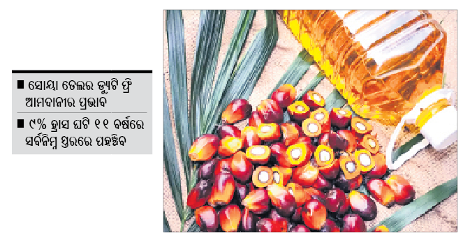 ନୂଆଦିଲ୍ଲୀ,୨୬।୫: ବିଶ୍ୱରେ ସର୍ବାଧିକ ପାମ୍ ତୈଳ ଆମଦାନୀ କରୁଥିବା ଭାରତ ଅନେକ ମାତ୍ରାରେ ଏହା ହ୍ରାସ କରିବା ସମ୍ଭାବନା ଦେଖାଦେଇଛି। ଡିଲରମାନଙ୍କ ପକ୍ଷରୁ ଦିଆଯାଇଥିବା ସୂଚନା ଅନୁସାରେ ଭାରତର ପାମ୍ ତୈଳ ଆମଦାନୀରେ ୧୯% ହ୍ରାସ ଘଟି ୧୧ ବର୍ଷରେ ସର୍ବନିମ୍ନ ସ୍ତରରେ ପହଞ୍ଚିପାରେ। ବର୍ତ୍ତମାନ ସୋୟା ତୈଳ ଶସ୍ତା ହୋଇଥିବା ସହ ଇଣ୍ଡୋନେସିଆର ପାମ୍ ତୈଳ ରପ୍ତାନି ଉପରେ କଟକଣା କାରଣରୁ ଏଭଳି ପରିସ୍ଥିତି ଦେଖାଦେଇଛି। ସରକାରଙ୍କର ସୋୟା ତୈଳର ଡ୍ୟୁଟି ଫ୍ରି ଆମଦାନୀର ଅନୁମତି କାରଣରୁ ସୋୟାବିନ୍ ତୈଳର ବଜାର ଭାଗୀଦାରି ବୃଦ୍ଧି ଘଟିବା ସମ୍ଭାବନା ଦେଖାଦେଇଛି। ବିଶ୍ୱର ସର୍ବବୃହତ୍ ଭେଜିଟେବଲ୍ ଅଏଲ୍ ଆମଦାନୀକାରୀ ପକ୍ଷରୁ ପାମ୍ ତୈଳ କ୍ରୟ ହ୍ରାସ ଦ୍ୱାରା ମାଲେସିଆର ପାମ୍ ତୈଳ ଦର ଉପରେ ପ୍ରଭାବ ପଡ଼ିପାରେ।